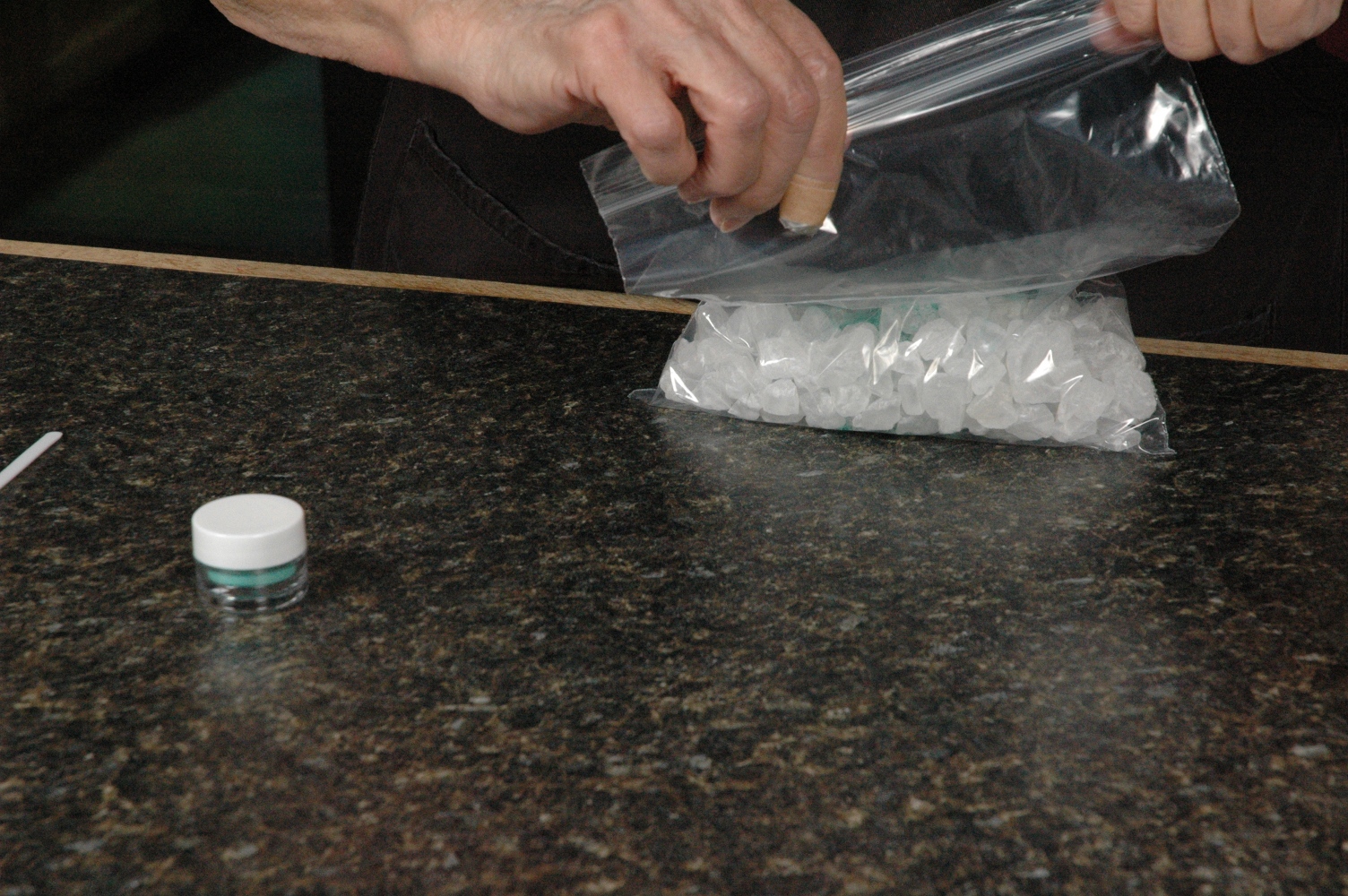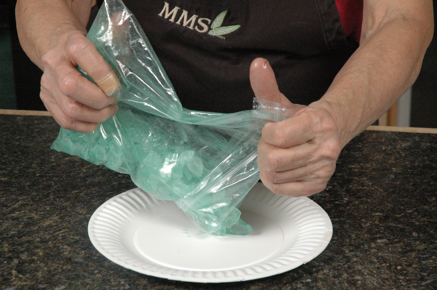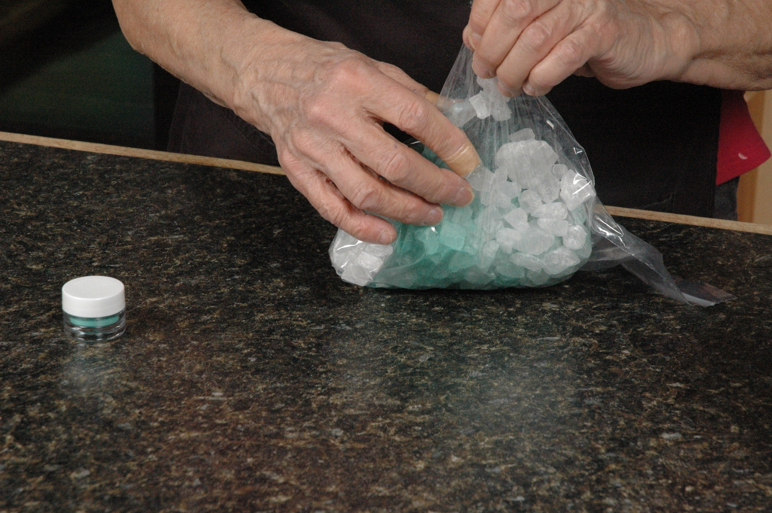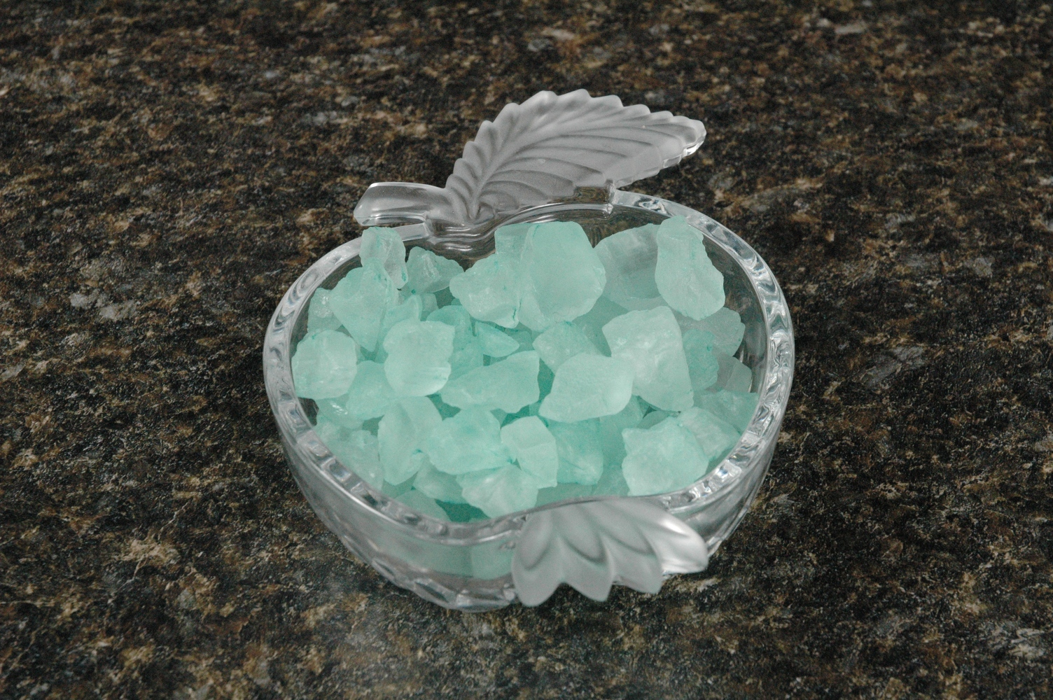 My project today is simple but beautiful and easy. Put 16 ounces of salt crystals in large zipper-style plastic bag. Add three 0.15 cc scoops of Aqua Mica. Close bag and shake until all crystals are coated evenly. Add 1 teaspoon of Dream Fragrance Oil in bag and shake. Put on a plate to allow fragrance to penetrate all pockets and cracks of the salt crystal. Put in your desired glass container. Wow!