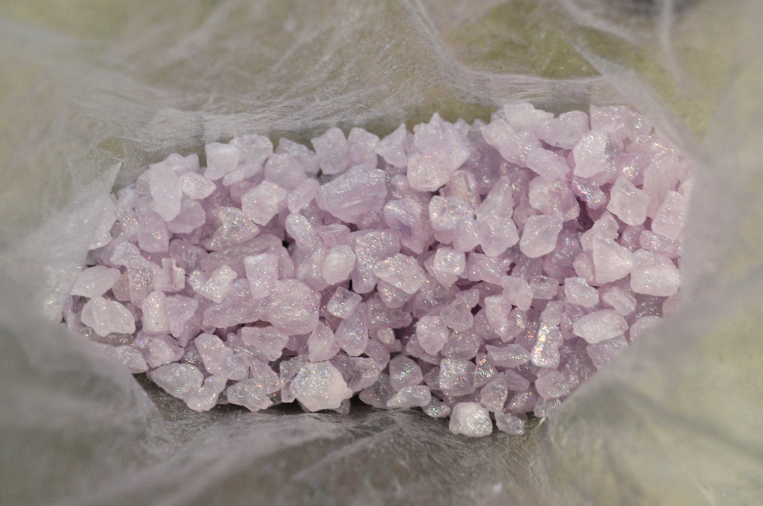 the container until you have filled it to the point you desire. My particular glass dish looked best with 9 ounces of the Extra Large Sized Salt. I added the salt to a plastic bag and gently spritzed the salt with the premixed Purple