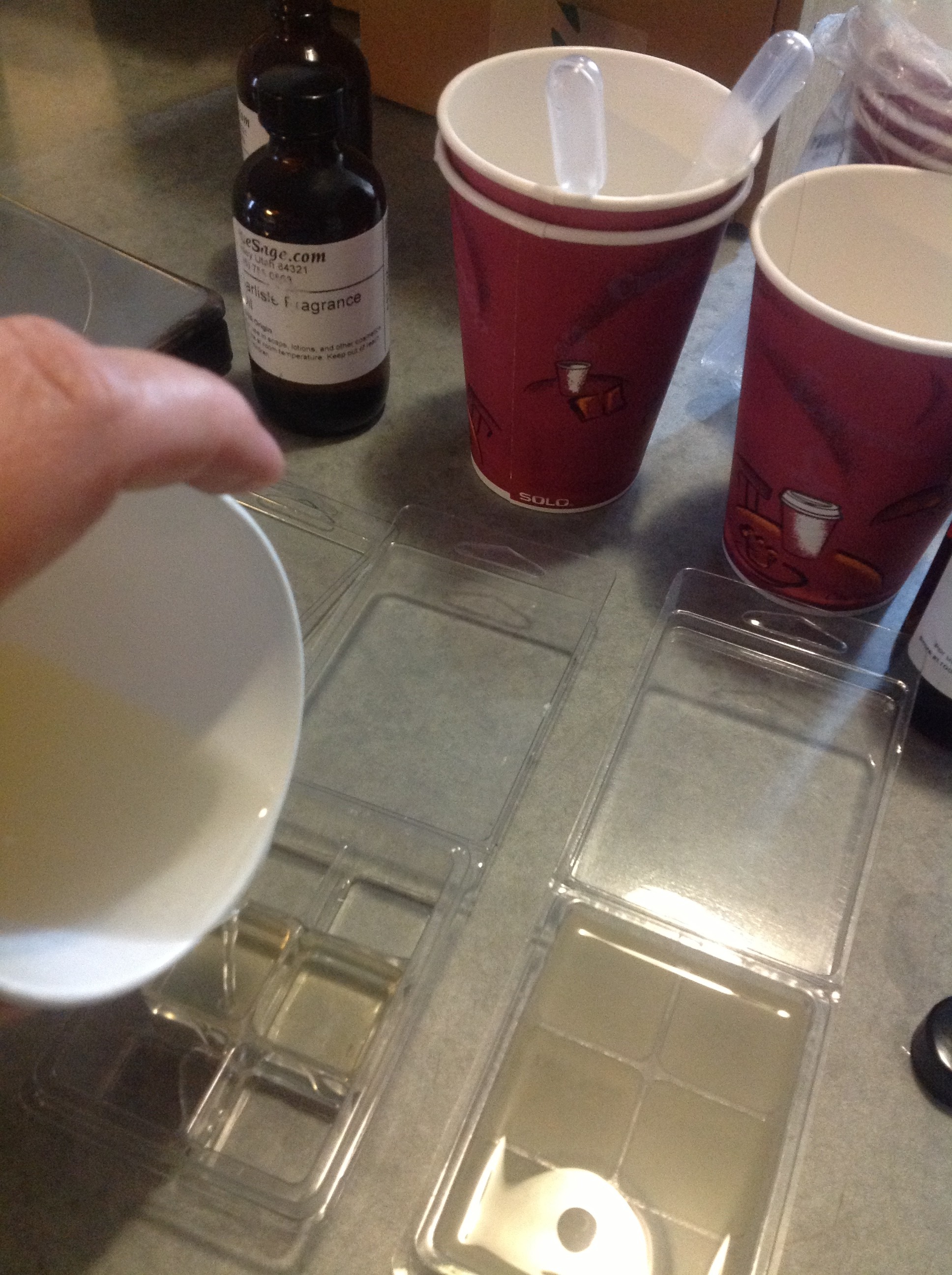 Weigh 1 lb. Soy Wax, add 1 lb. Fractionated Coconut Oil. Heat together on medium until fully melted. We used the Mulit-cube clamshell so we measured out 2.4 oz. of melted product into a small paper cup, then added fragrance 2 ml, stirred and then poured into the Multi-cube Clamshell. Be careful to not over heat your mixture, if it is too hot it can melt your Multi-cube Clamshells. After wax melts are cooled, then close the Multi-cube Clamshell container and label.