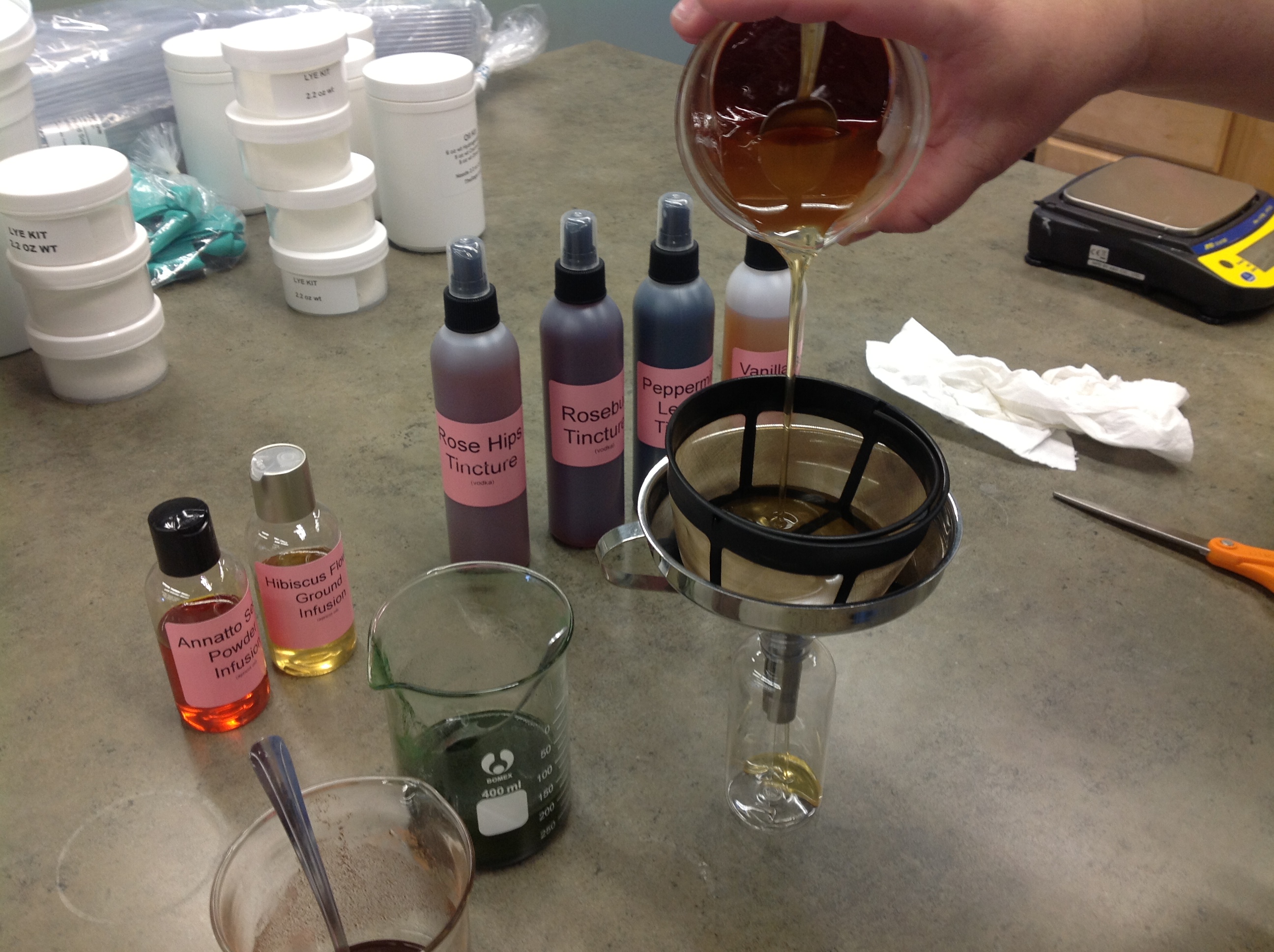 The photos show the tinctures I bottled into sprayer bottles, the oil infusions I bottled into 4 oz bottles with disk tops and the Matcha Green Tea soap I made with the tea infusion. I added the lye directly to the tea infusion and that is what caused the very dark color. It lightened in the finished soap dramatically! The last photo shows the soap weeping the glycerin and tea infusion. This was just stirred back in prior to the soap setting up completely.