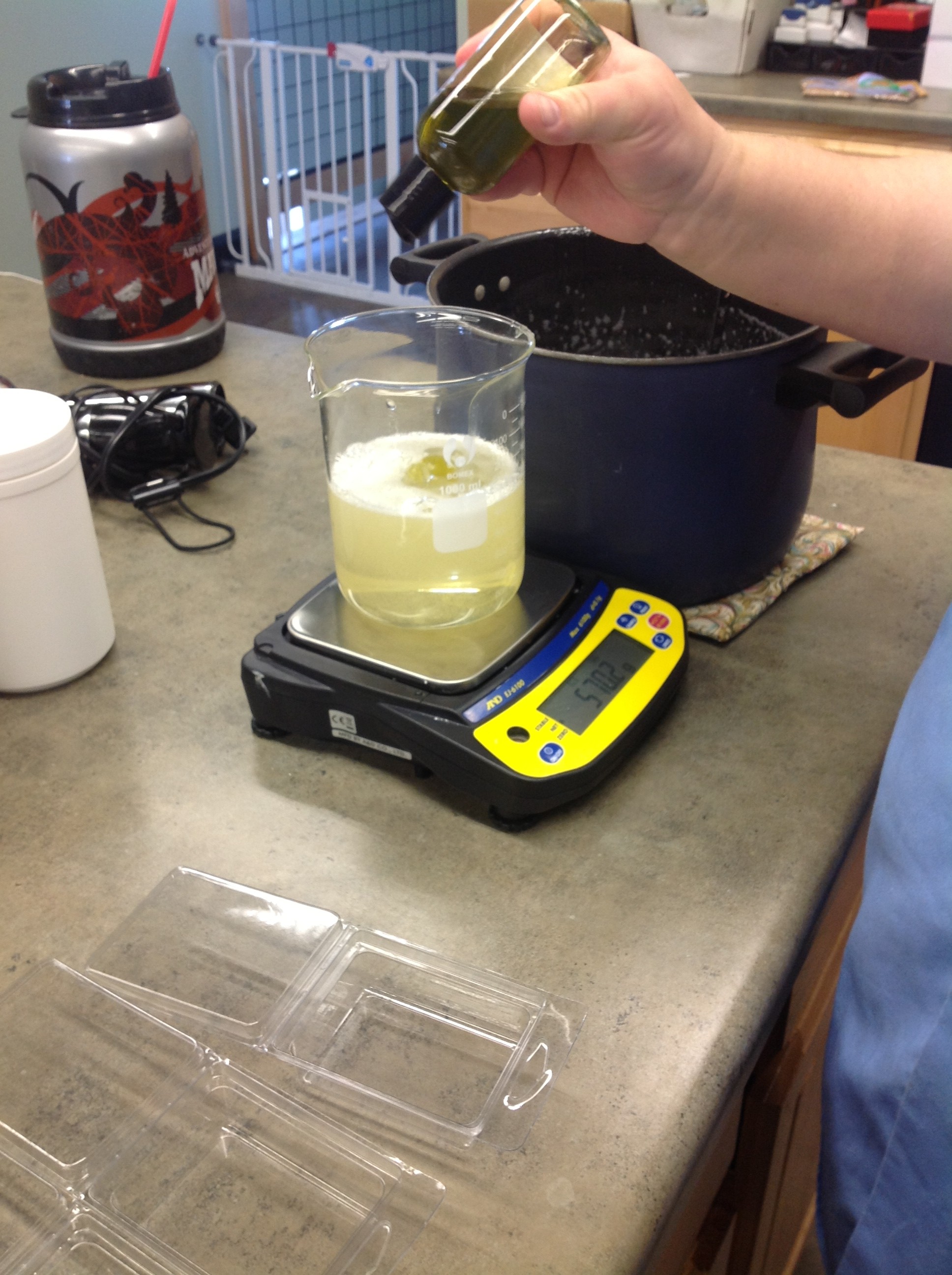 I added 1% infused oil into melted soap; I measured about 570 grams of soap and 6 grams of the infused oil. This allowed me to fill approximately 8 of the clamshell containers that I chose. Whatever container you choose to use you will need to do a little calculation to determine the amount of soap to infused oil to use.