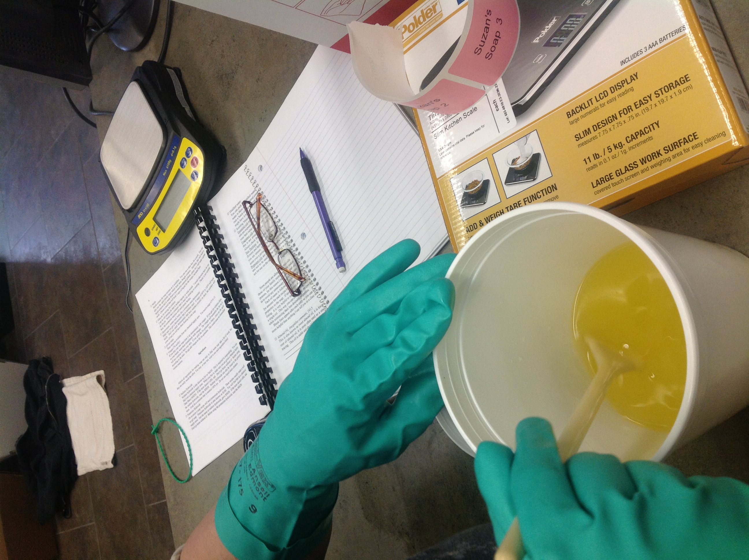 Begin by weighing all of the oils into a microwave safe container. Heat gently until liquid. Add the Sodium Hydroxide to the water to form a lye solution. Allow the oils and the lye to cool separately until they reach a lower temperature. We do not want to have the soap overheat and volcano. When cooled, mix the oils and lye solution together and blend with immersion blender until trace is achieved. Once your mixture has made it to trace add in your powder approximately 1 teaspoon, mix thoroughly then pour into a mold and allow to sit for 24 hours. Cut the soap. Allow the soap to cure. Longer curing time will result in a harder bar.