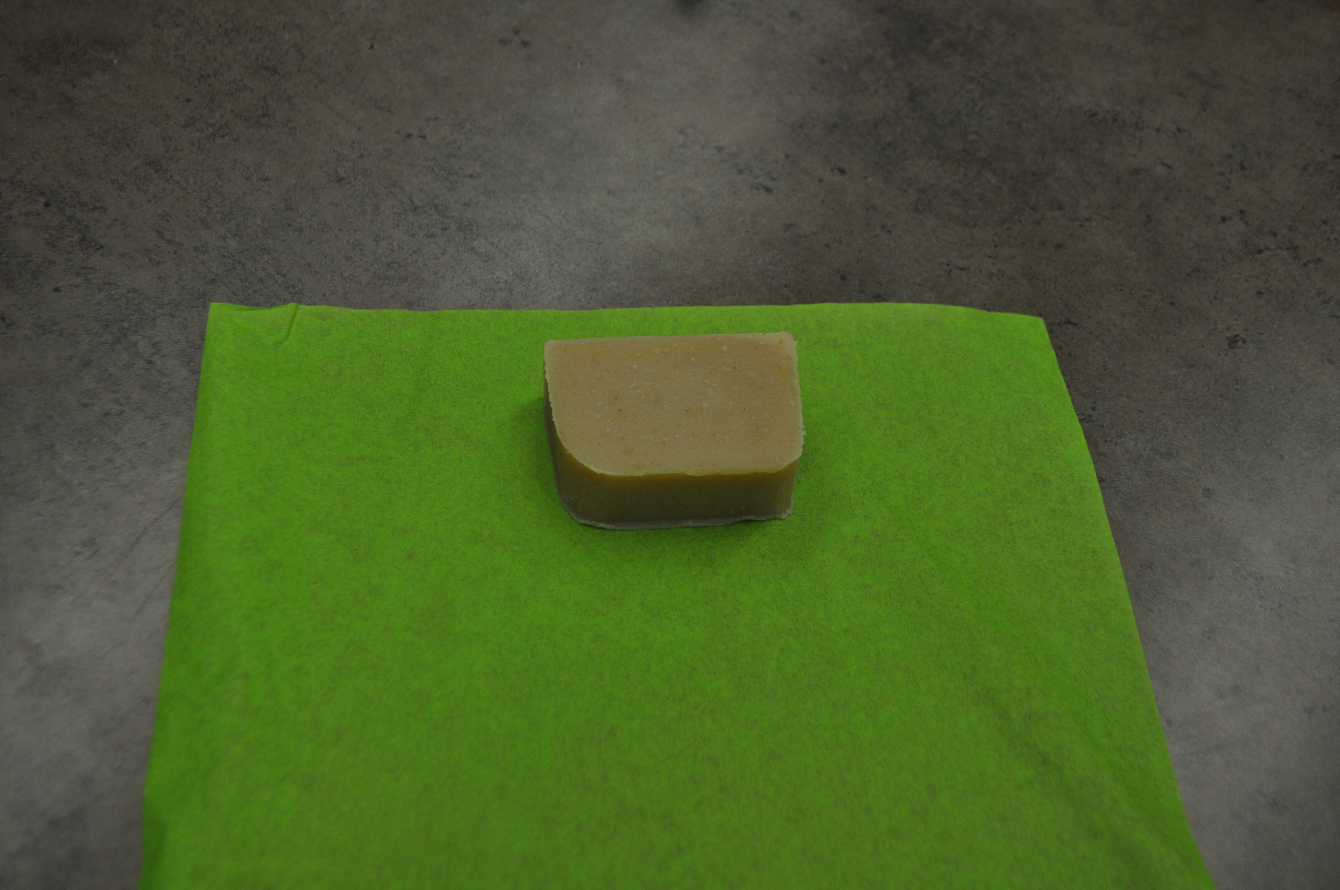 Lay your tissue paper out flat, short end toward you. Place your soap in the center, closer to the top. Wrap the top of the tissue paper toward yourself and roll the soap until you reach the bottom of the tissue paper. Secure with a small piece of tape.