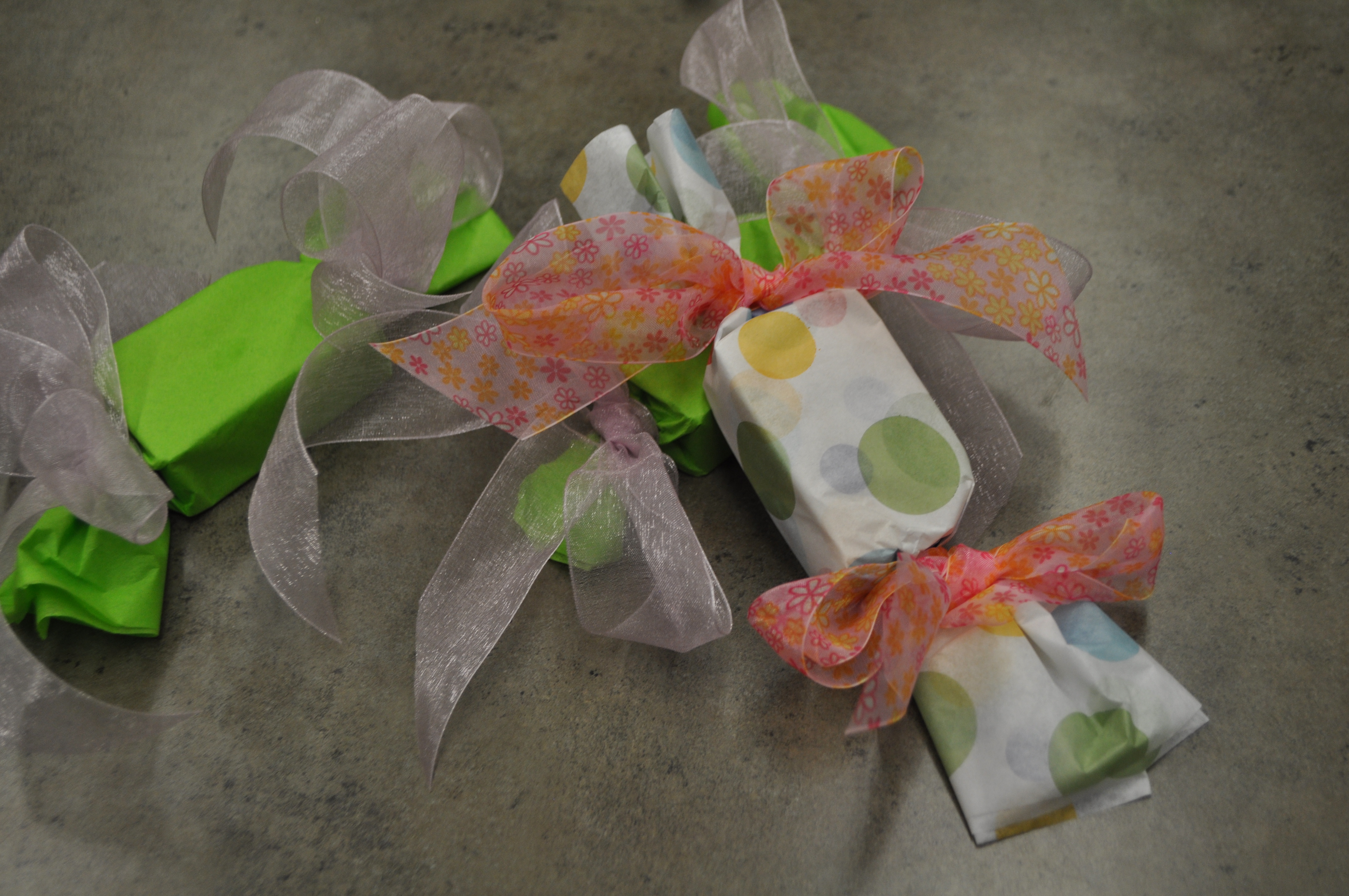 For this project you will need your finished soap cut into bars, tissue paper, tape and ribbon. Let’s get started!