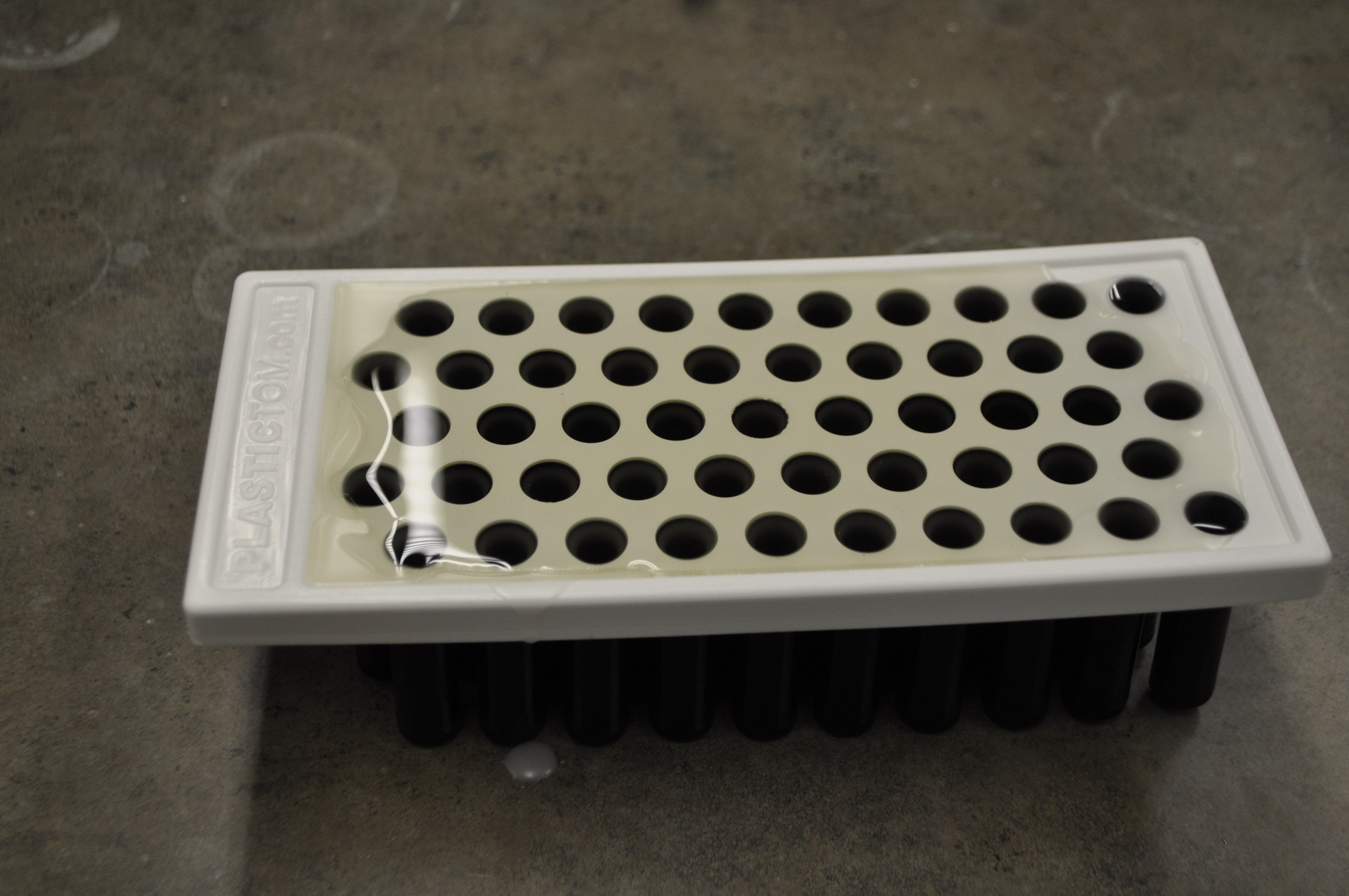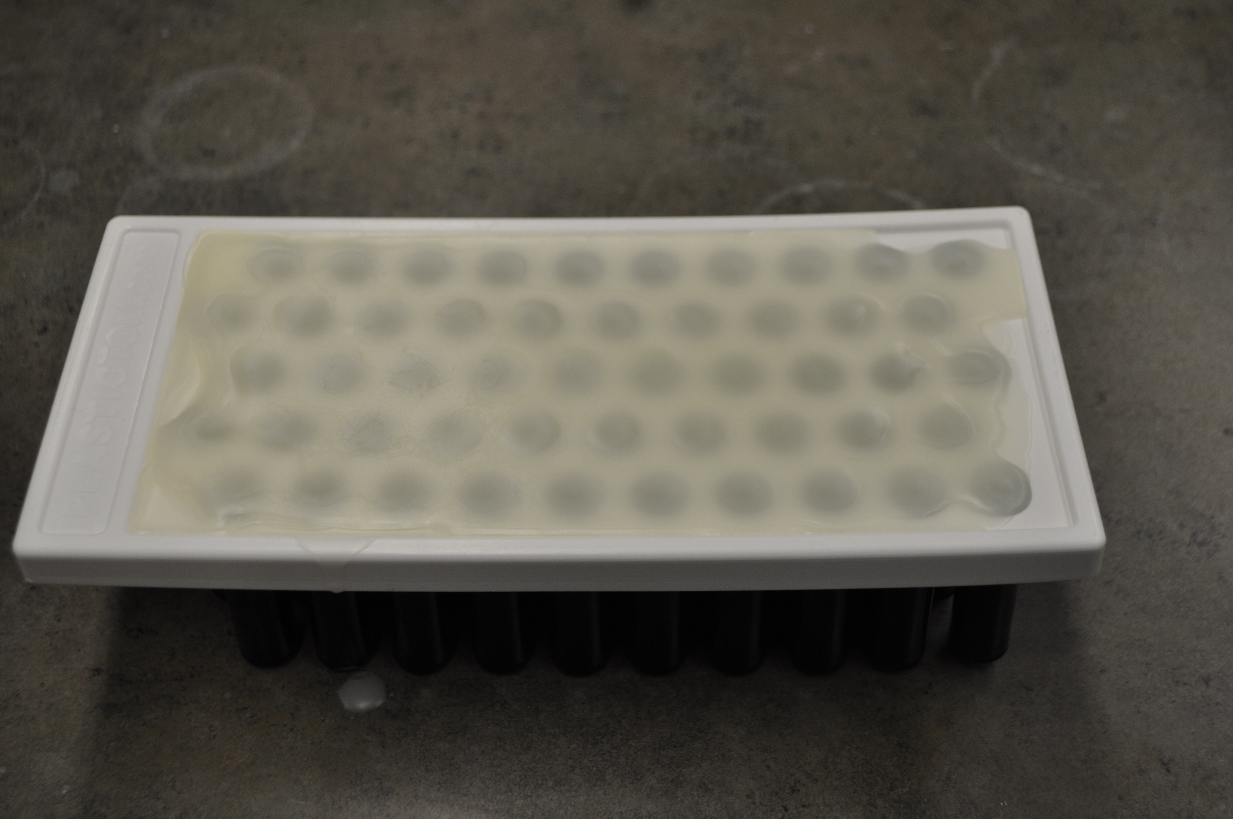 From here, you can either pipette the mixture into your tubes or you can use a filling tray. I will be using a filling tray because they are simple and fast. If you are using a filling tray, insert your tubes into your tray. Flood the tray with your melted lip balm. Allow the mixture to cool. Scrape off the excess. I like to use a plastic putty knife. Remove the tubes from the tray and cap.