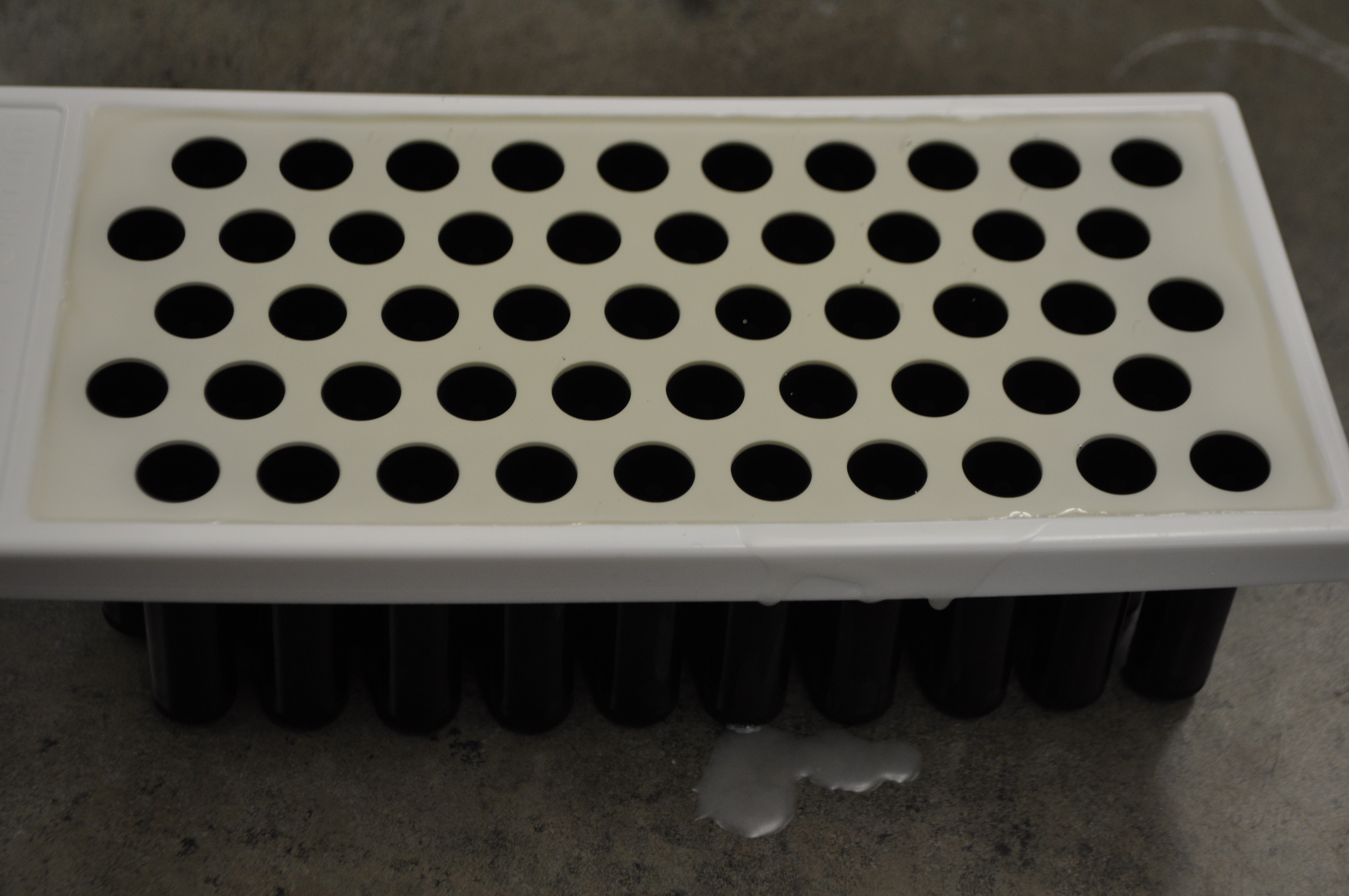 From here, you can either pipette the mixture into your tubes or you can use a filling tray. I will be using a filling tray because they are simple and fast. If you are using a filling tray, insert your tubes into your tray. Flood the tray with your melted lip balm. Allow the mixture to cool. Scrape off the excess. I like to use a plastic putty knife. Remove the tubes from the tray and cap.
