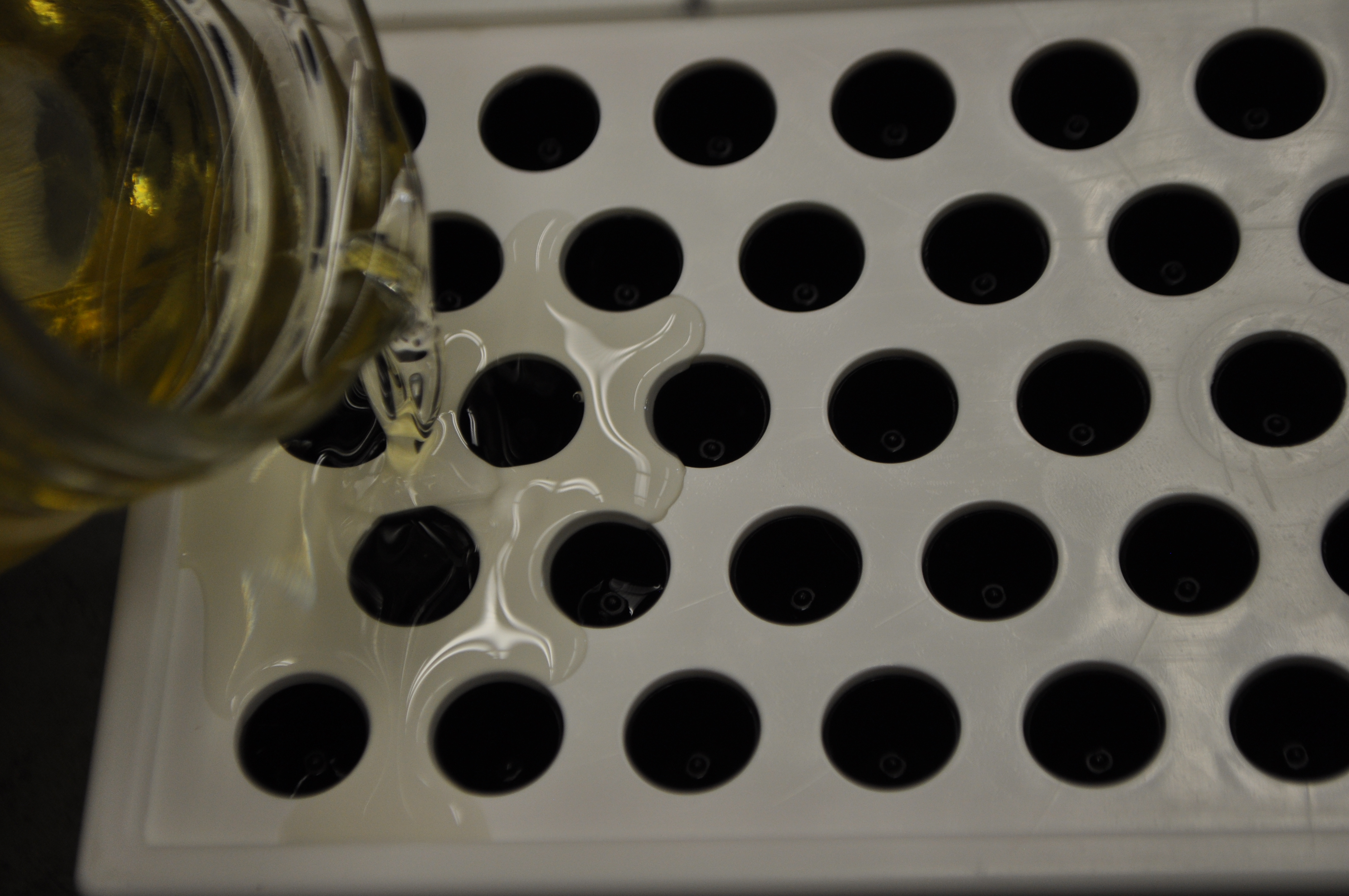 From here, you can either pipette the mixture into your tubes or you can use a filling tray. I will be using a filling tray because they are simple and fast. If you are using a filling tray, insert your tubes into your tray. Flood the tray with your melted lip balm. Allow the mixture to cool. Scrape off the excess. I like to use a plastic putty knife. Remove the tubes from the tray and cap.