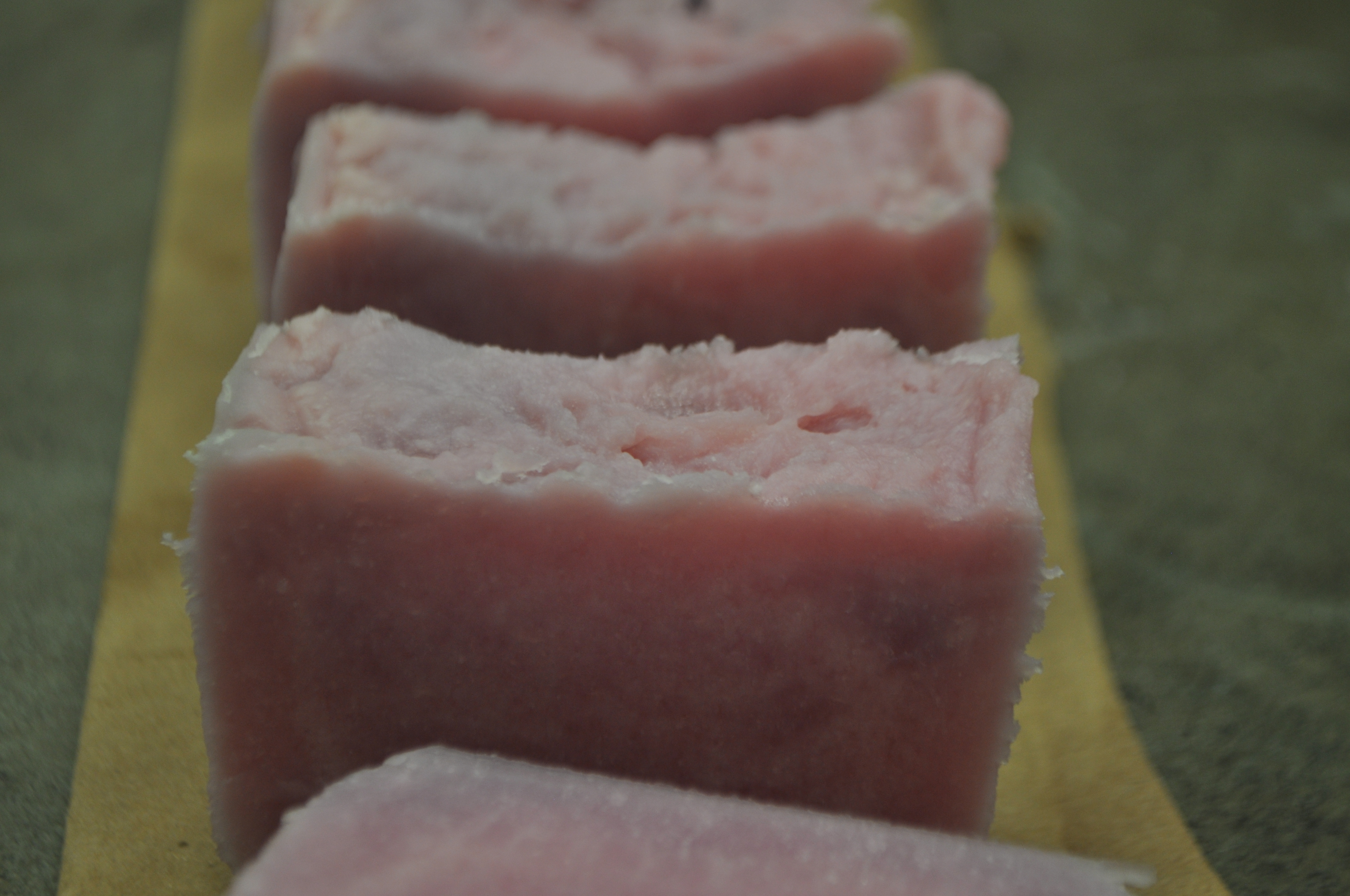 Once things were closer to temperature, I mixed my lye and oils together. (I should have waited a little longer. I ended up with a volcano.) Once I reached trace, I added my fragrance oil and hand stirred it in. I poured my soap into my mold at left it for about an hour. Andee then came to tell me I had a beautiful pink volcano in the blog kitchen. I rushed back into to scoop my soap back into the mold. The result? Not the most elegant top but I like the rustic, mottled color that resulted.
