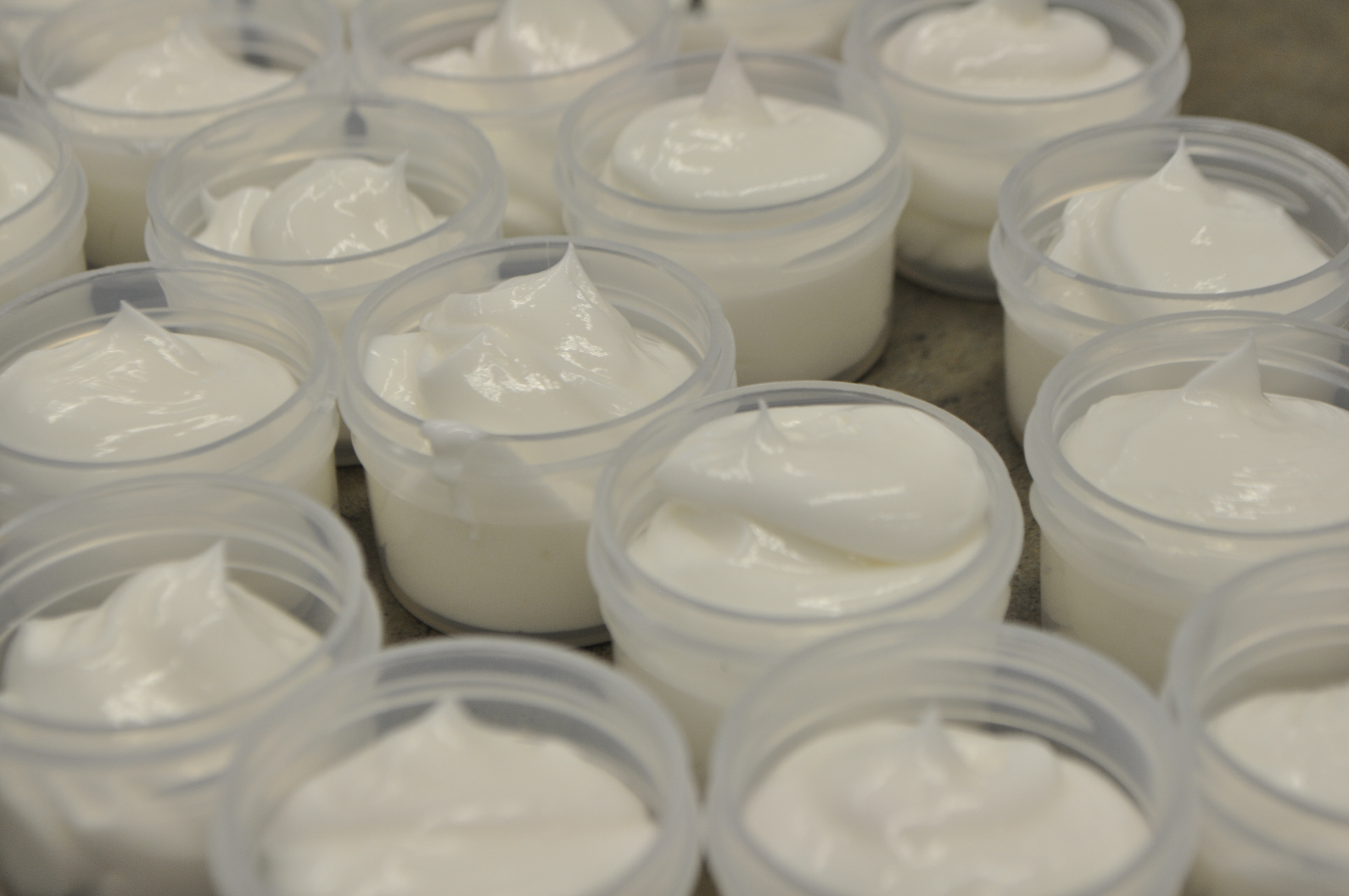 Once the cream has fully cooled, put into jars. I like to scoop the lotion into a plastic bag and pipe it into jar like frosting. It gives clean edges and makes for speedy filling.