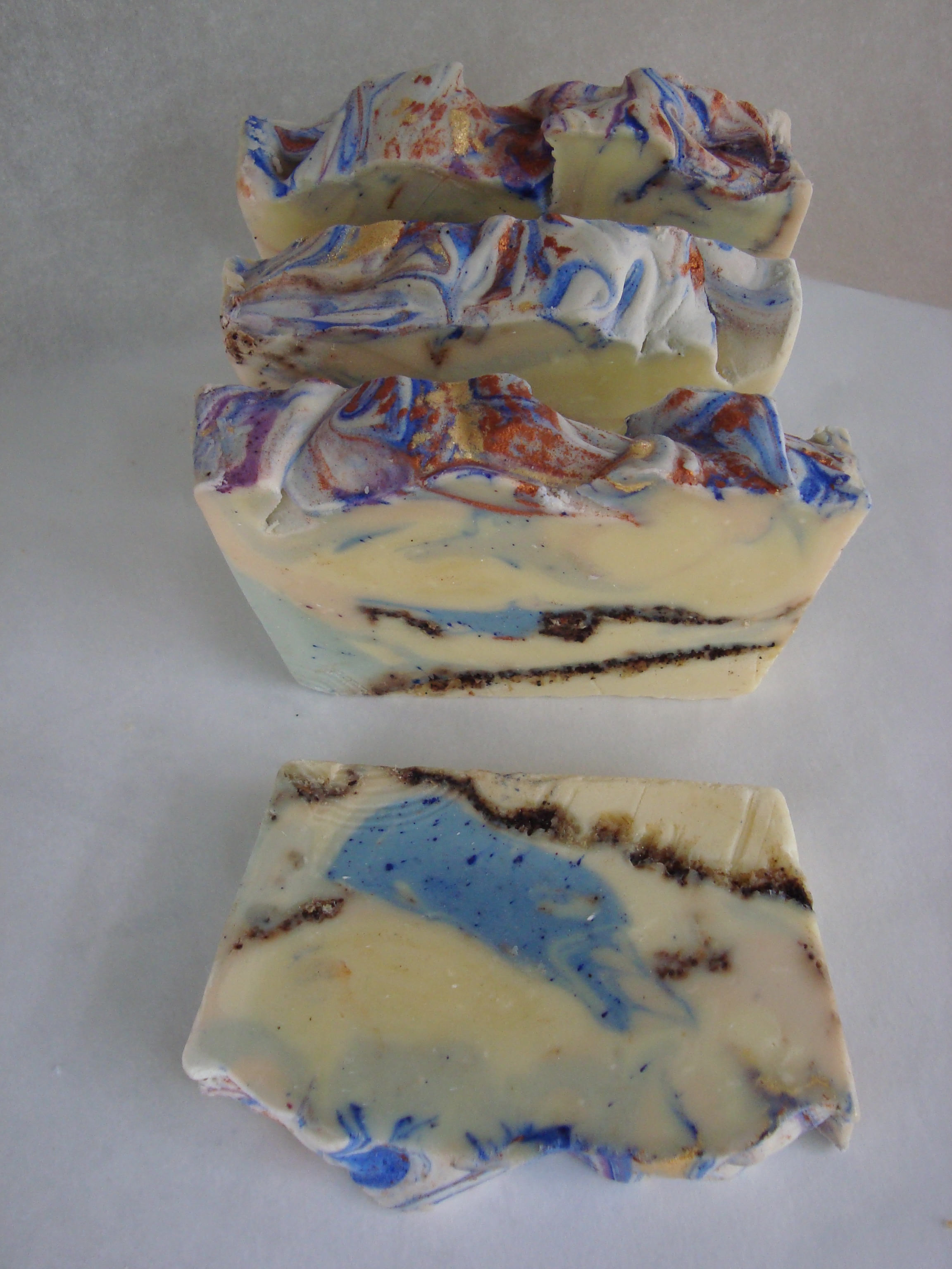 The result is beautiful! There are subtle layers of colors and brown lines with shimmering of copper. There is a story in each slice. The final soap is exciting!