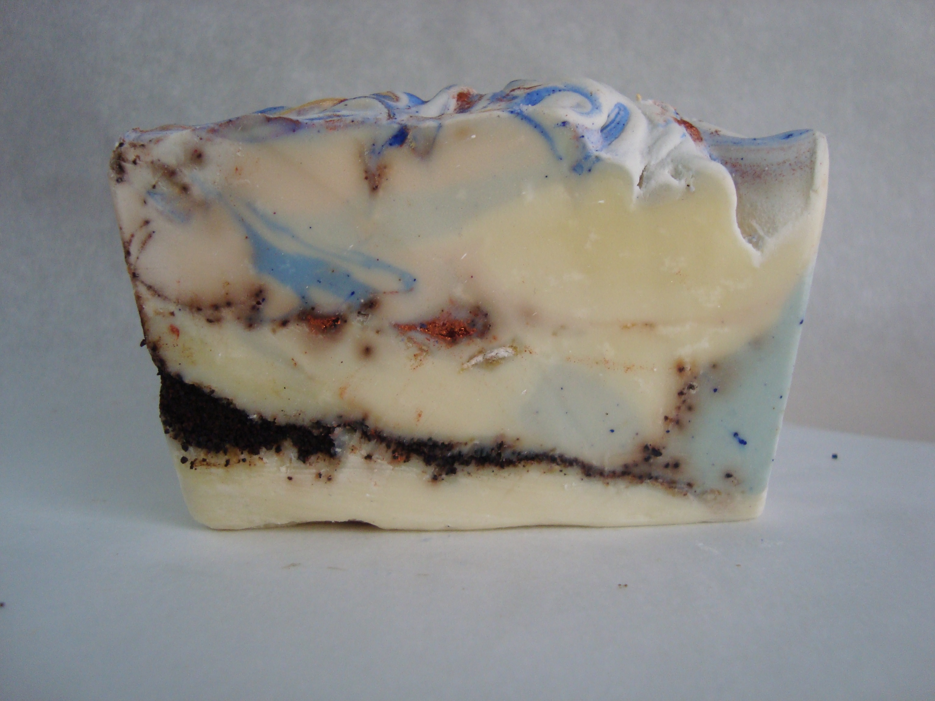 I began tipping the loaf pan for the first layer of snow. This was followed by layering the oatmeal to represent snow and form a base for the coffee grounds. This brown layer represents the fence and dead grasses. Next I carefully layered blue for the water and another layer of brown for the distant shore. I placed dark blue for the mountain finally layering with pink, white and blues for the winter sky. The top was decorated with blue and pink and copper reflecting the soaps origins.