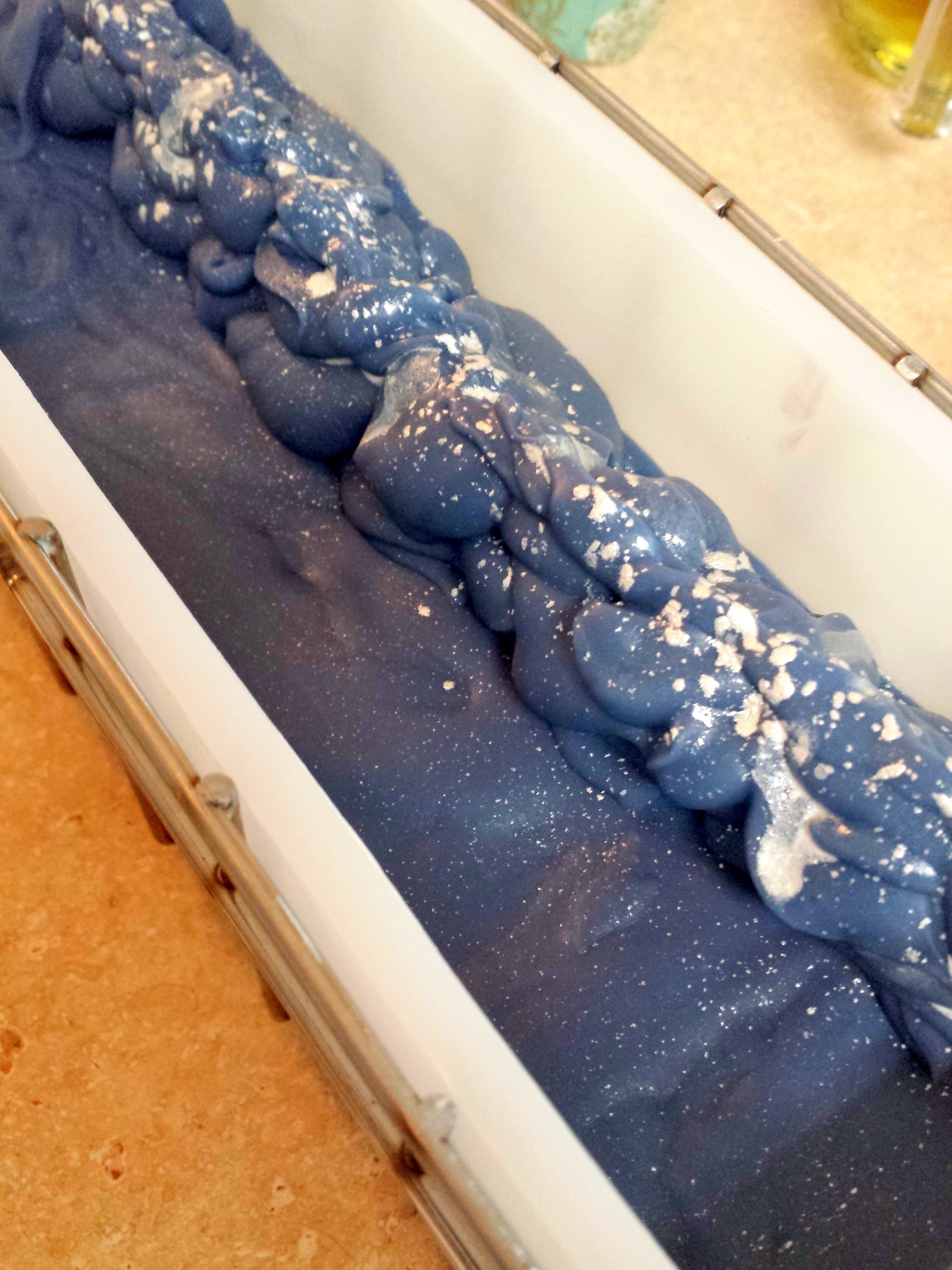 Carefully, I chose new colors to compliment my goals. This time I thought maybe I should stay with the exact same blue just use more or less and add some black into the mountain layer. This helped even out the overall color of the whole soap. Yay.