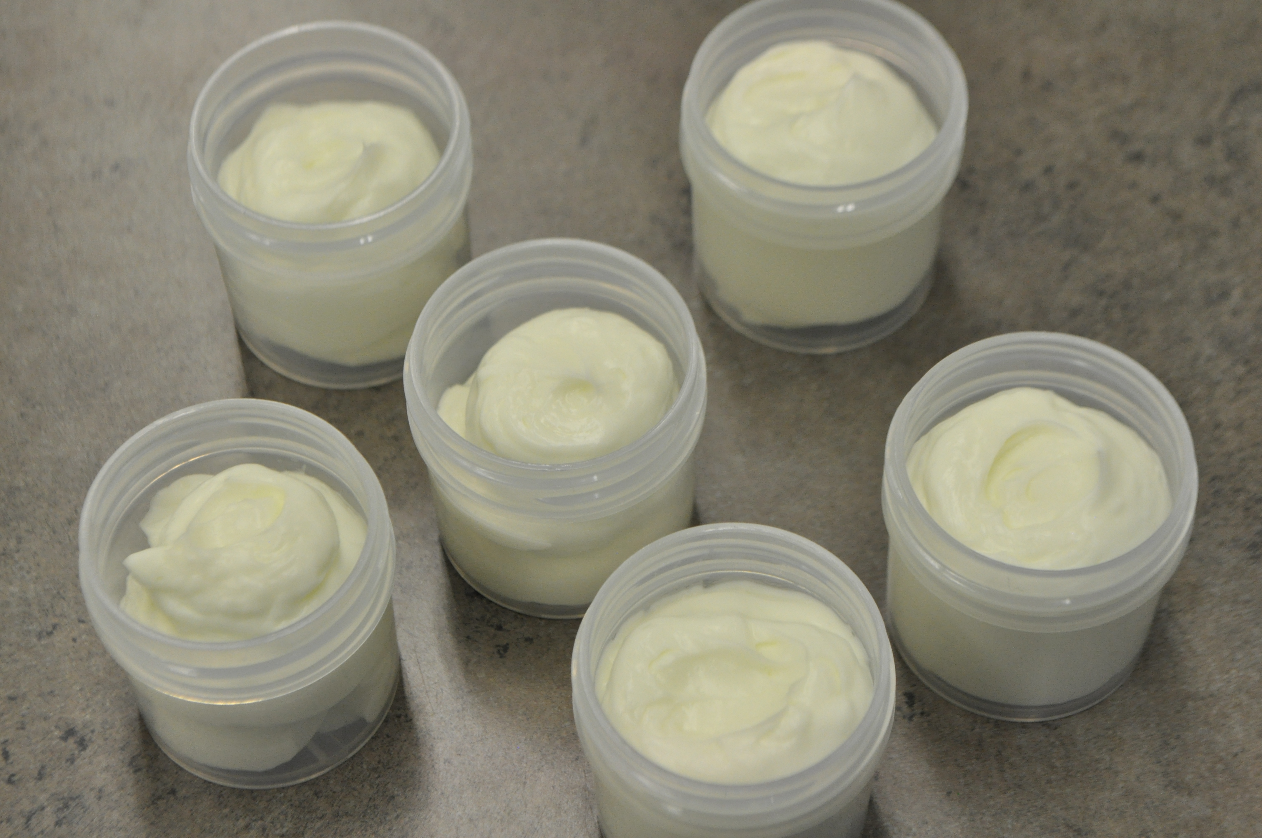 At this point I like to scoop the lotion into a plastic bag so I can pipe in into jars. This makes it much faster to fill my containers and it minimizes the amount of clean up I need to do. I am all about simple and easy!