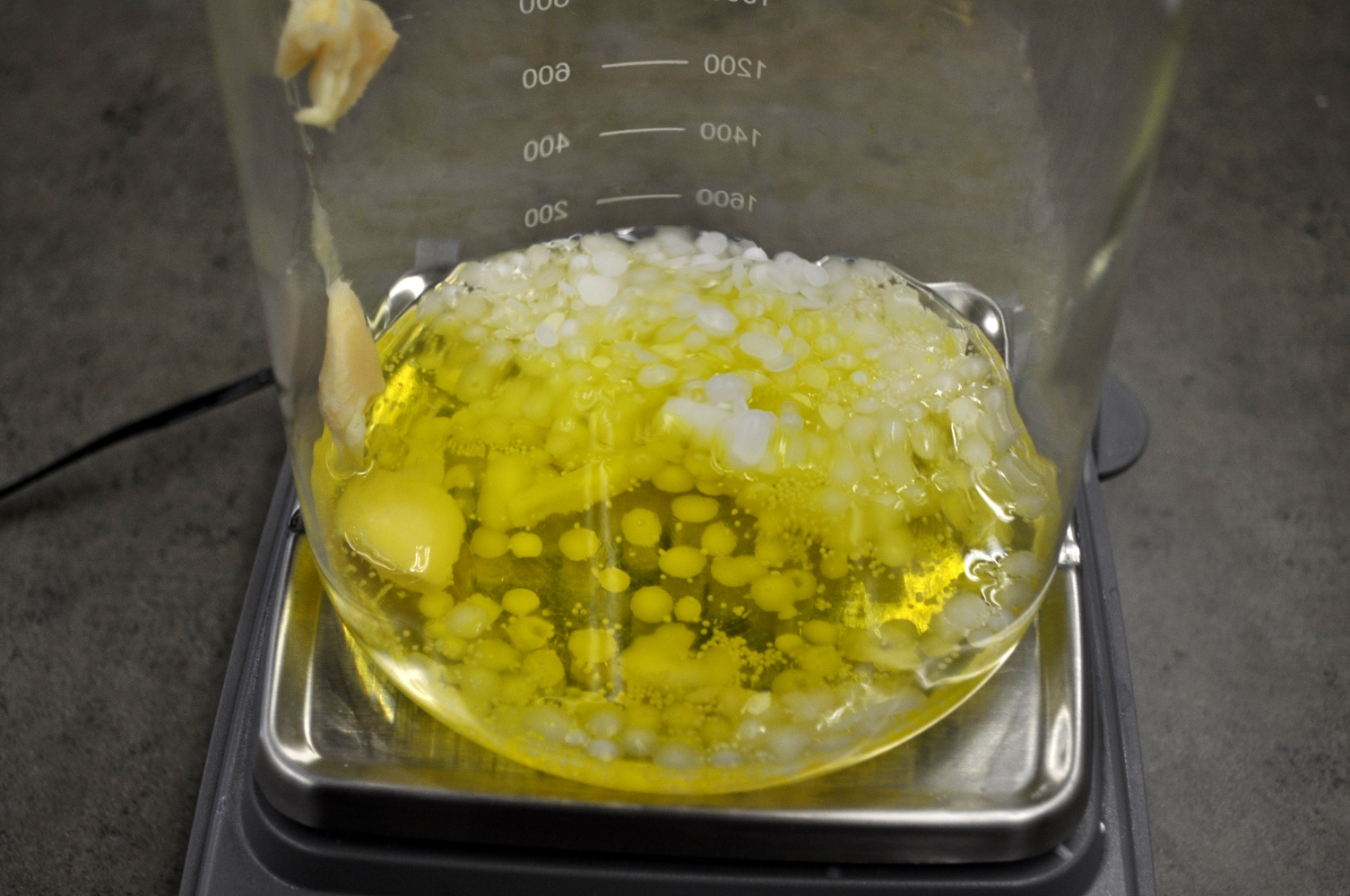 | Recipe in Grams 5 grams Glycerin 10 grams Stearic Acid 21 grams Emulsifying Wax 20 grams Semi-Solid Shea Oil 29 grams Coconut Oil Fractions infused with Turmeric 32 grams Macadamia Nut Oil 380 grams Water 2.5 grams Liquid Germall Plus |