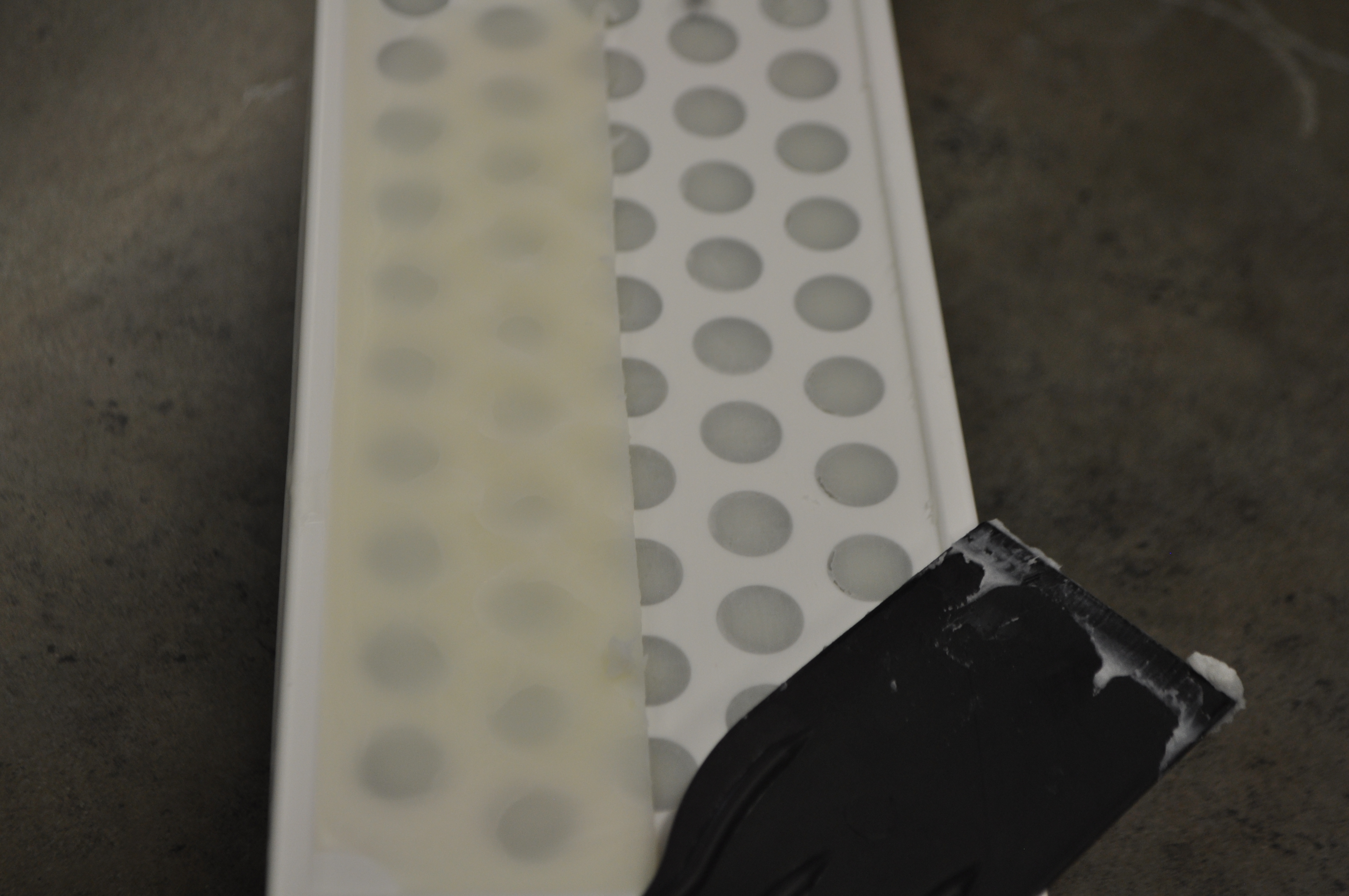 From here, you can either pipette the mixture into your tubes or you can use a filling tray. I will be using a filling tray because they are a simple and fast method of filling a lot of tubes at one time. If you are using a filling tray, insert your tubes into your tray. Flood the tray with your melted lip balm. Allow the mixture to cool. Scrape off the excess. I like to use a plastic putty knife. Remove the tubes from the tray and cap.