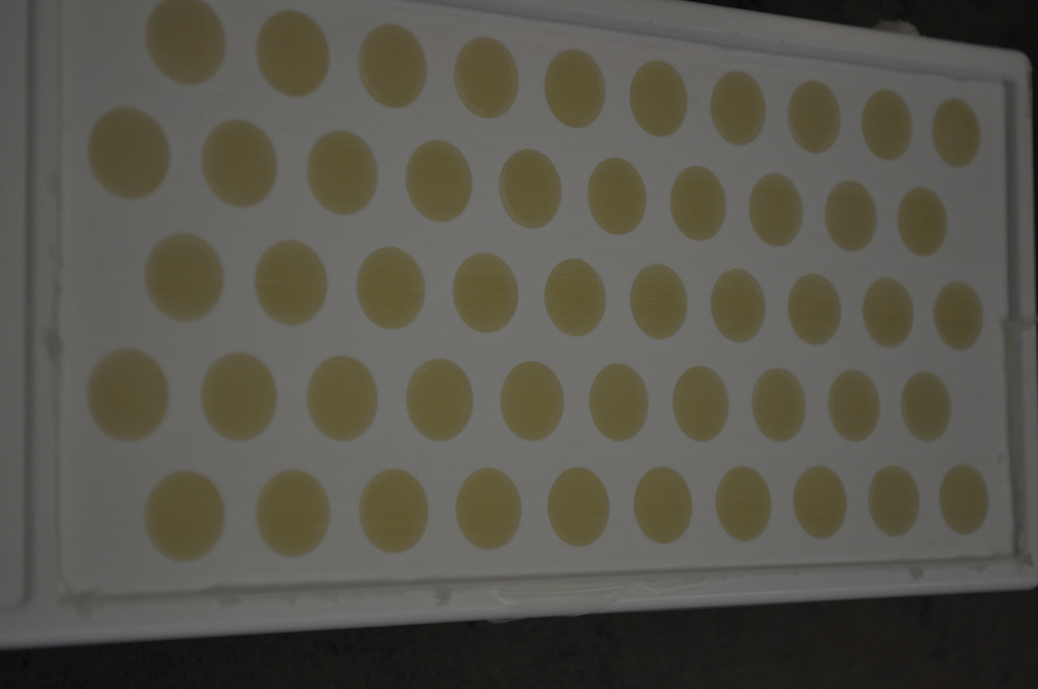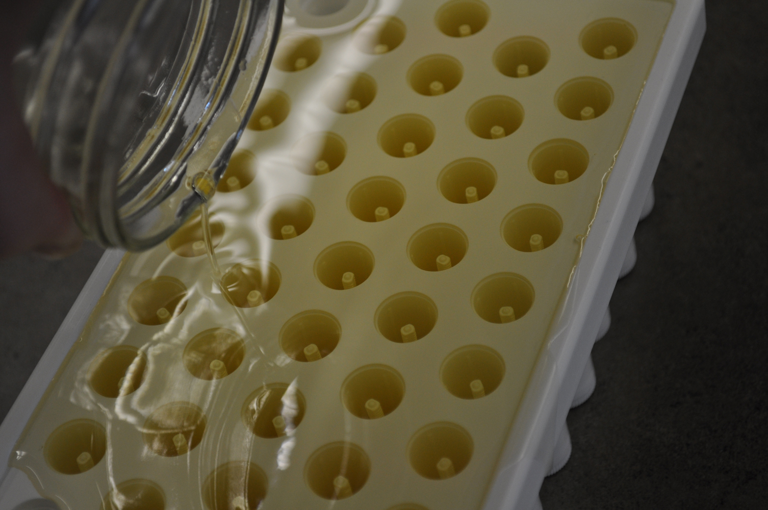 From here, you can either pipette the mixture into your tubes or you can use a filling tray. I will be using a filling tray because they are a simple and fast method of filling a lot of tubes at one time. If you are using a filling tray, insert your tubes into your tray. Flood the tray with your melted lip balm. Allow the mixture to cool. Scrape off the excess. I like to use a plastic putty knife. Remove the tubes from the tray and cap.