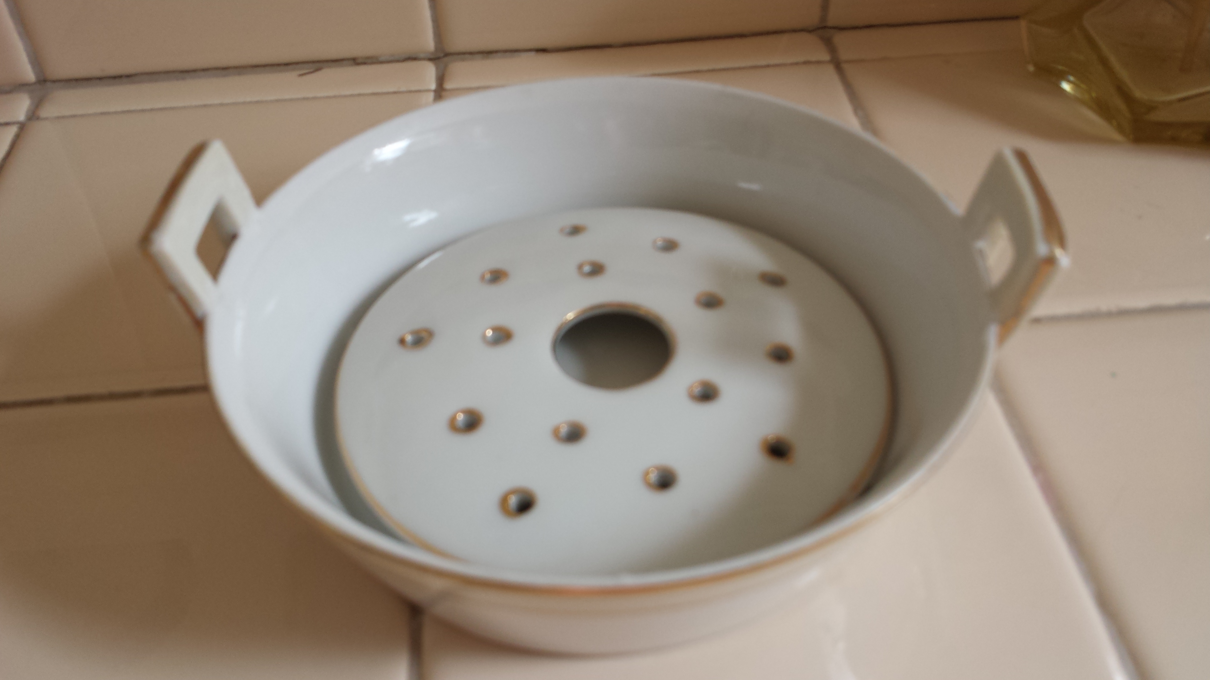 I was lucky enough to find this porcelain beauty in a thrift store. By the mark on the bottom, I can tell it was made between 1911 and 1940. I’m guessing it was made in about 1920 due to the style of the painting. I love and collect old Japanese porcelain. The interior of the bowl contains a separate insert for draining the soap. We use it every day.