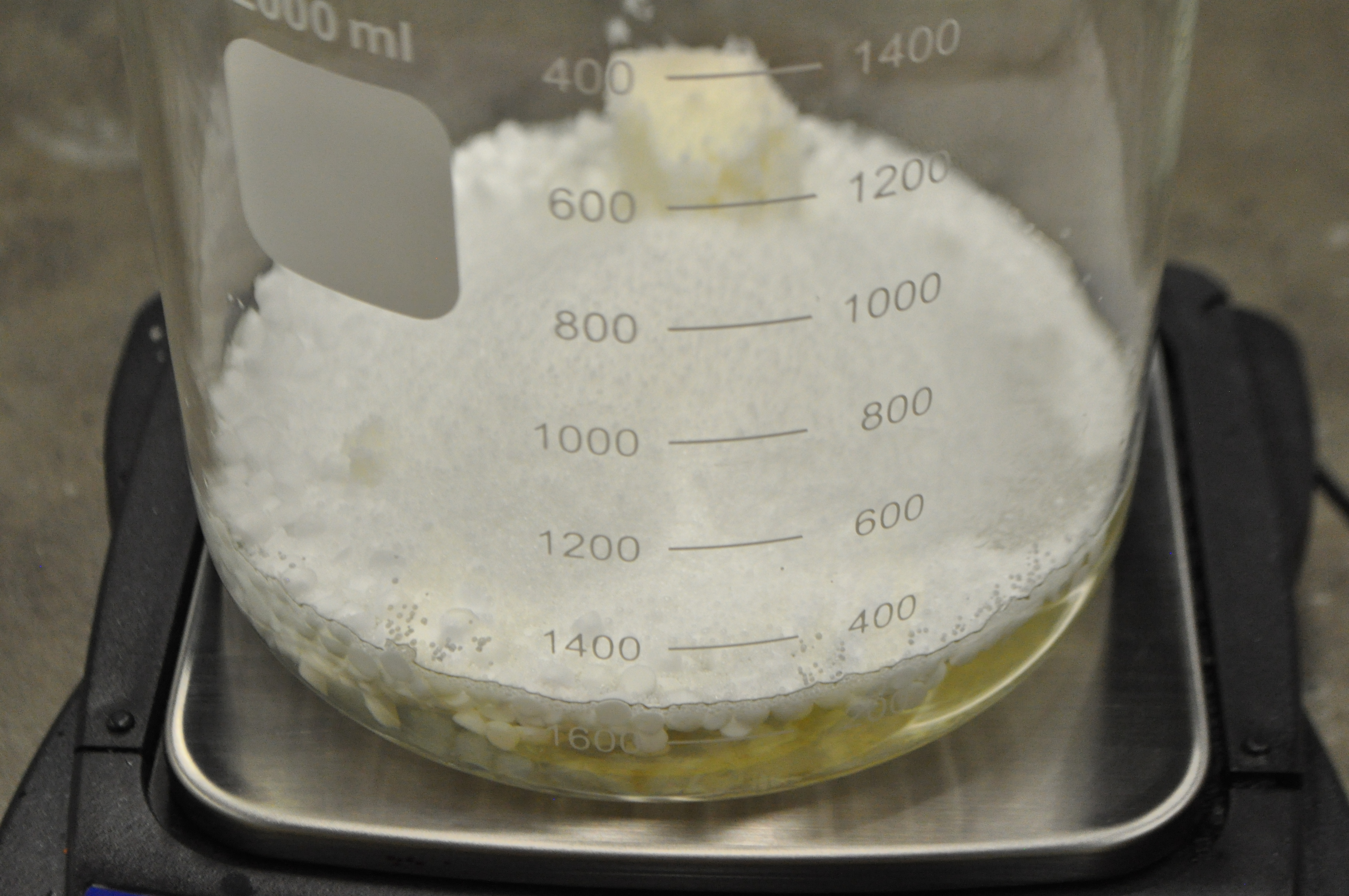 Weigh everything except the Liquid Germall Plus, Cotton Candy Fragrance Oil and color into a microwave safe container. Heat gently until hot. The mixture does need to be hot enough to melt our stearic acid. We recommend heating in 30 second increments. This way you can check on the mixture and avoid super-heating the lotion.