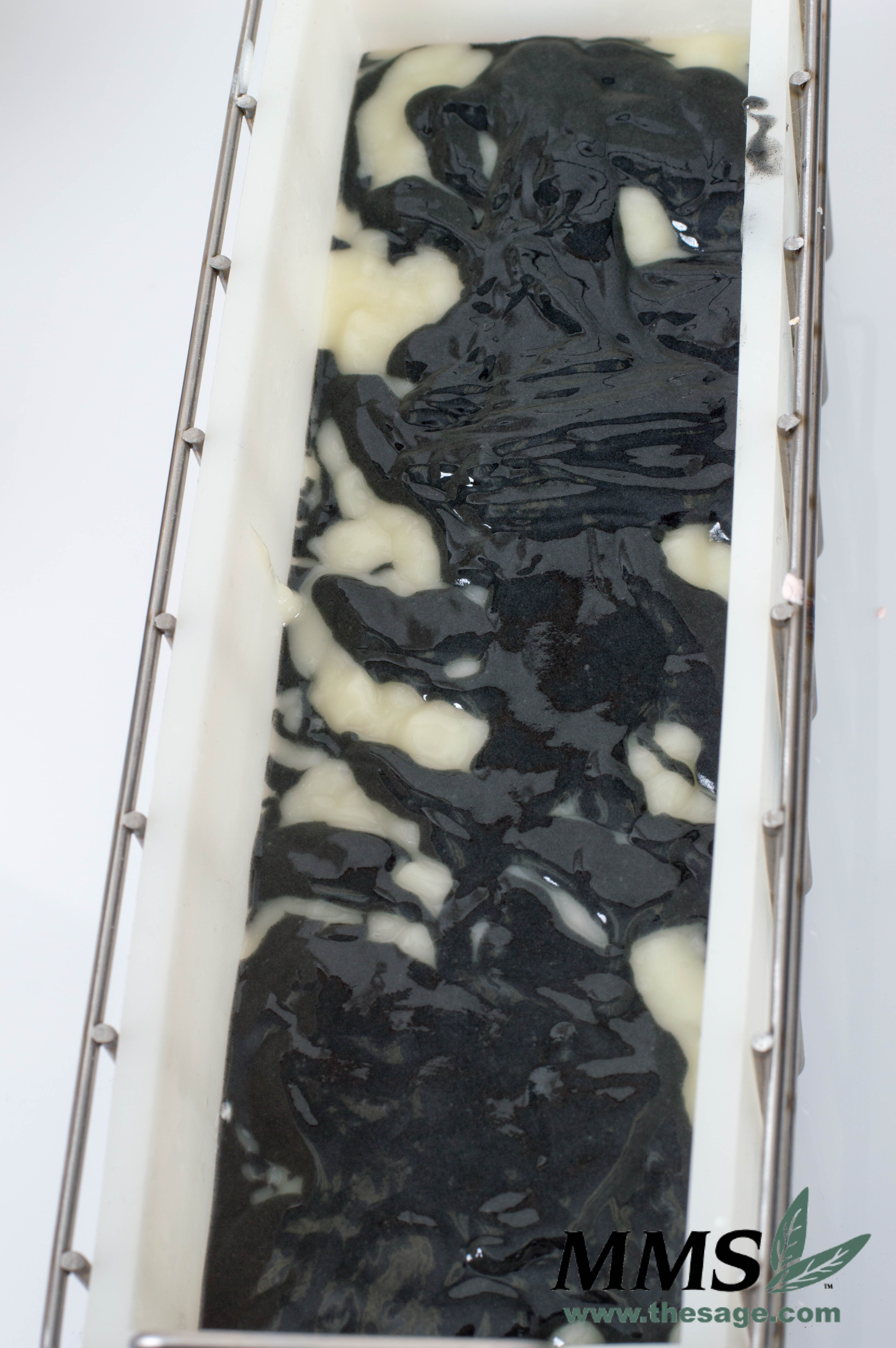 Using your immersion blender, mix both batches of soap until you reach a light trace. We want them to be at similar thicknesses for the best swirling potential. When a light trace has been achieved, add the Chinese Star Anise Essential Oil and Activated Charcoal into the correctly designated soap pot. I used the immersion blender to quickly mix the Chinese Star Anise Essential Oil into the natural color soap and then moved to the black batch so I didn’t have to worry about accidentally adding color to my natural soap!