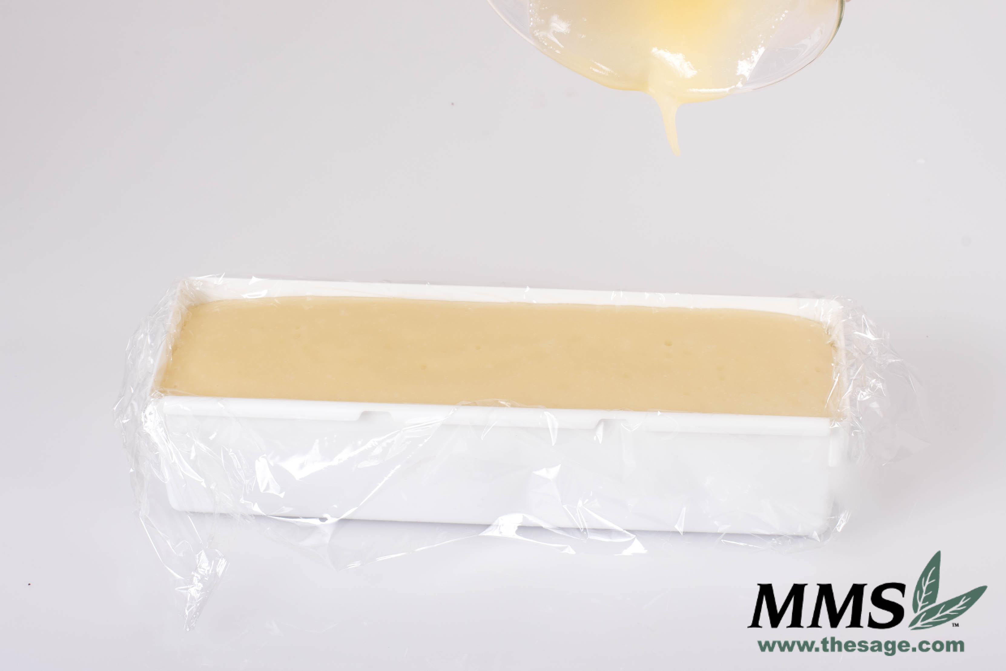 Once my oils and lye solution cooled to around 130° F, I was ready to mix them together. The cold January weather here in Utah means that my soap needed a little bit more heat to help jump-start the saponification process. I gently poured the lye solution into the oil and began mixing with the immersion blender. As soon as my raw soap mixture had reached light trace, I added the Chocolate Mousse Fragrance and stirred again to thoroughly mix. After the raw soap and fragrance were thoroughly mixed, I poured the concoction into my mold and left it on the counter where it could sit for 24 hours before cutting.