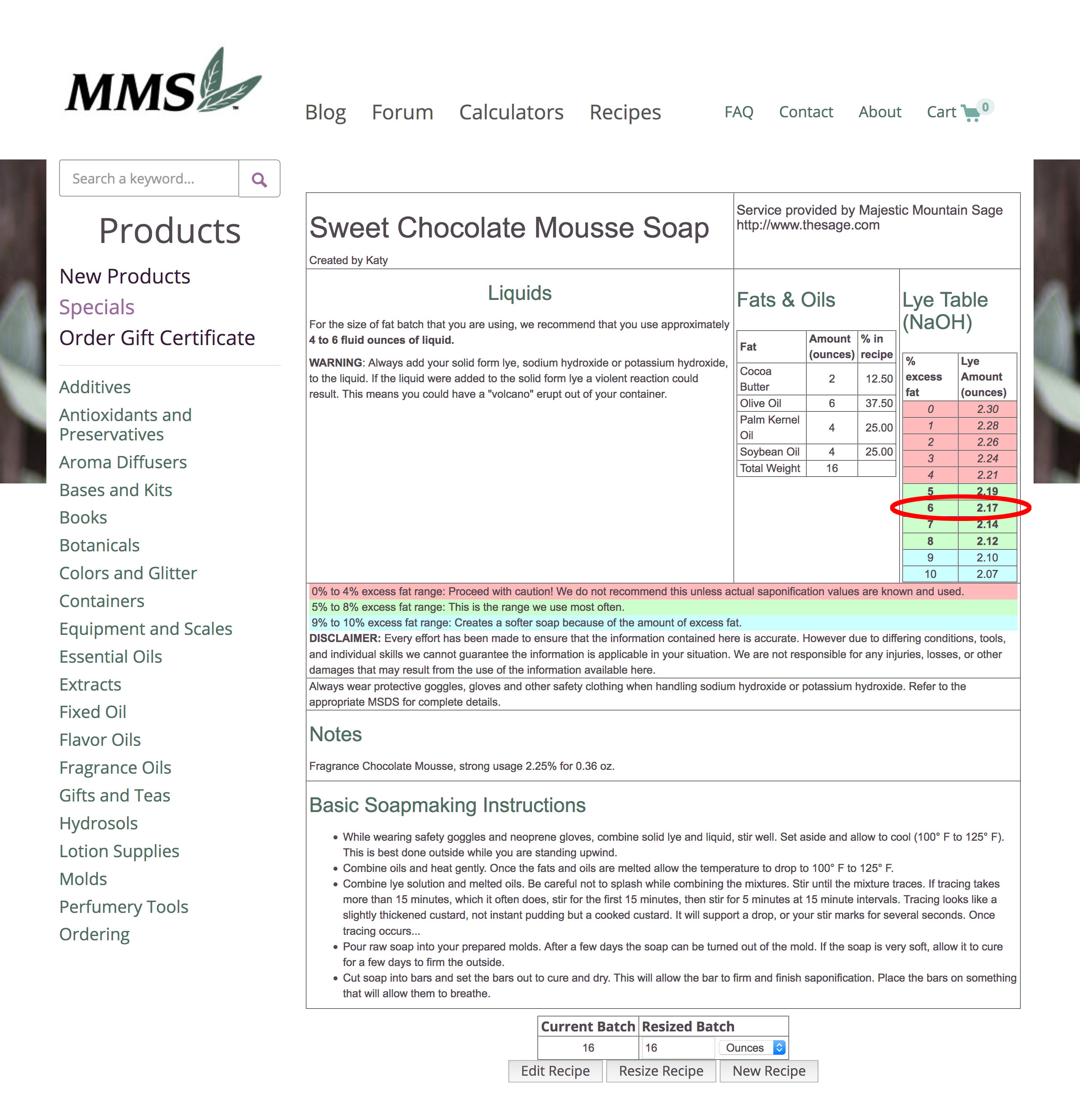 Recipe in Ounces 2 oz Cocoa Butter 4 oz Palm Kernel Oil 6 oz Olive Oil 4 oz Soybean Oil 6 oz Water 2.17 oz Sodium Hydroxide (lye) 0.36 oz Chocolate Mousse Fragrance Oil |