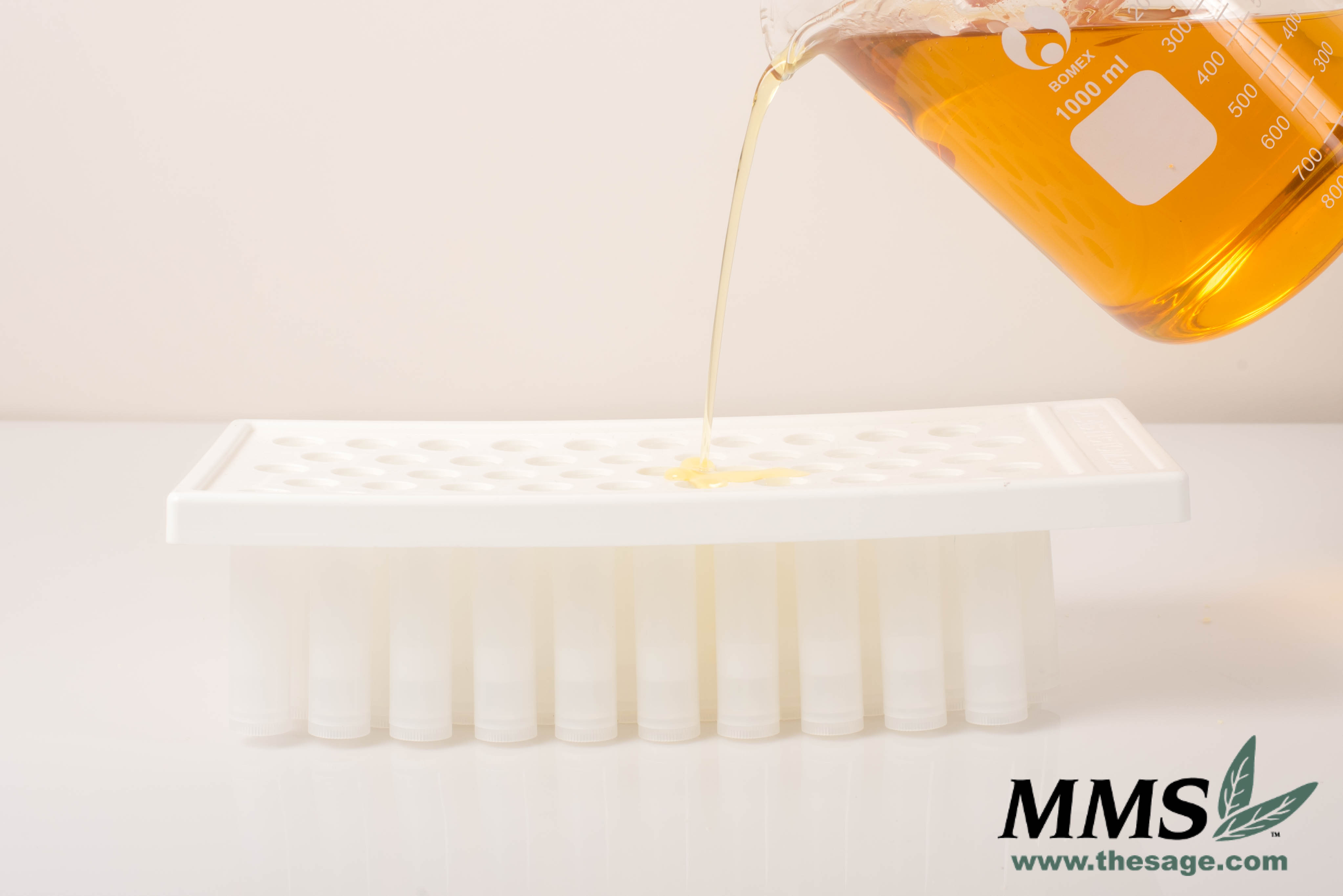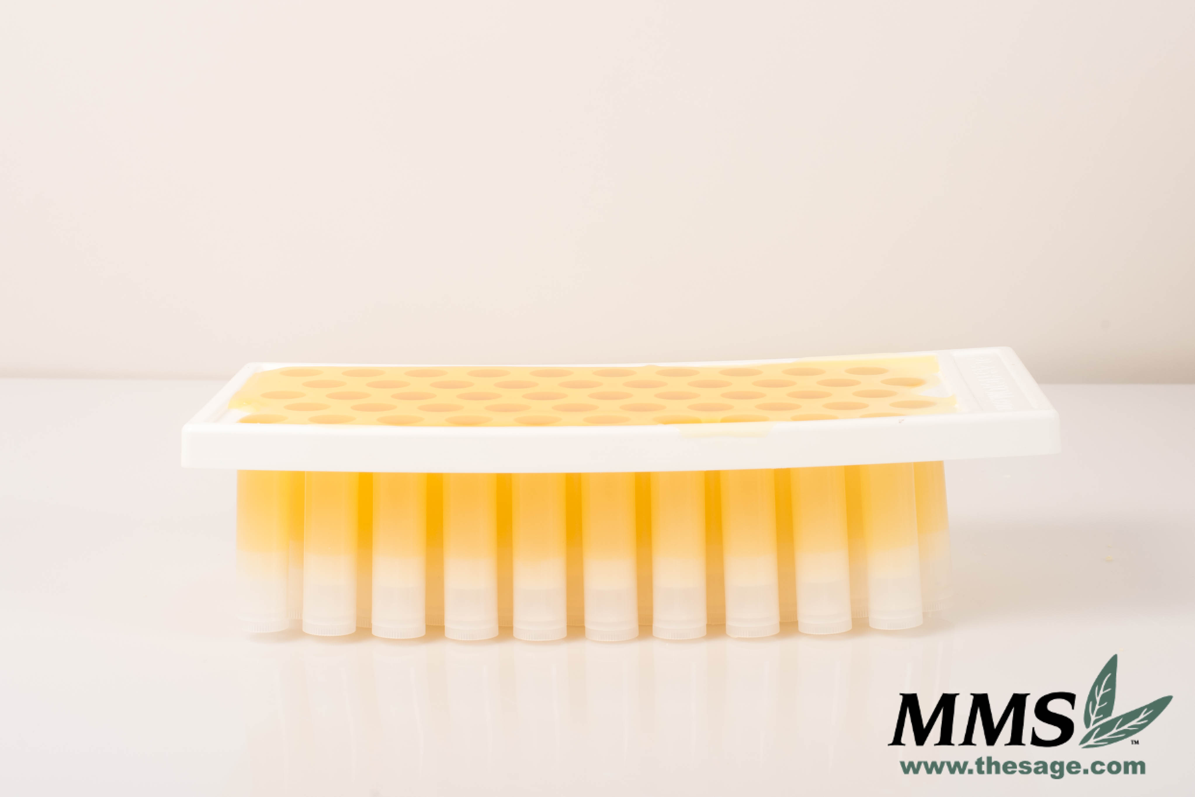 From here, you can either pipette the mixture into your tubes, or you can use a filling tray. I like using a filling tray because they are simple and fast. If you are using a filling tray, insert your tubes into your tray. Flood the tray with your melted lip balm. Allow the mixture to cool. Scrape off the excess. I like to use a plastic putty knife. Remove the tubes from the tray then cap.