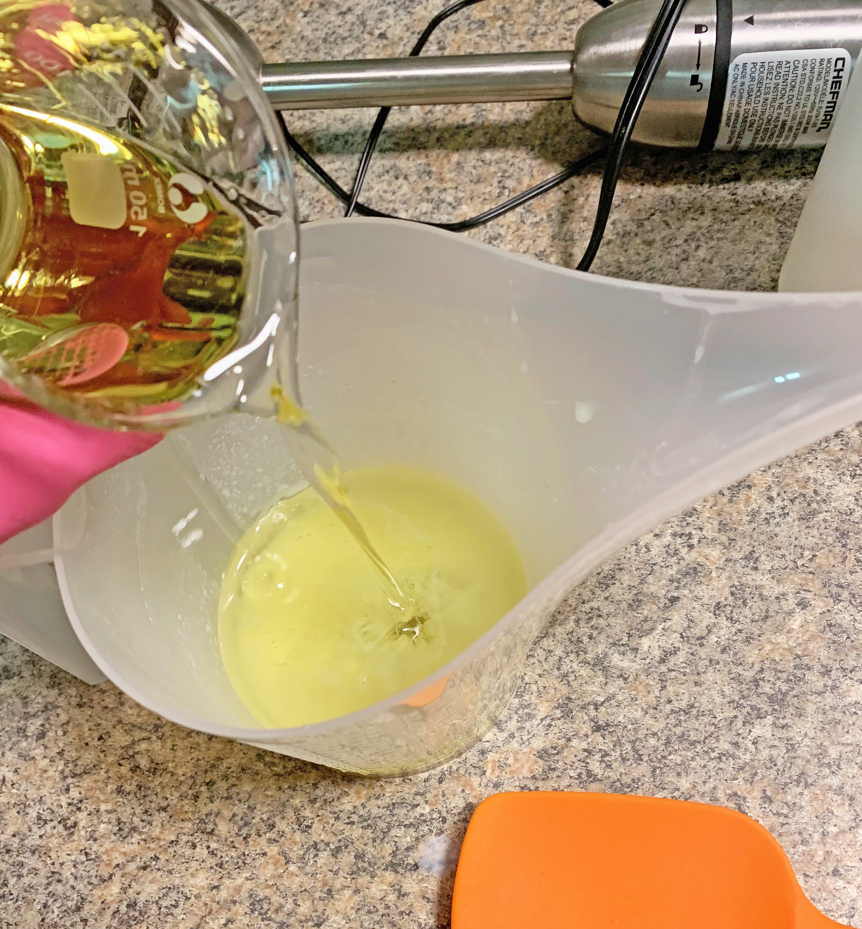 Measure oils into microwave-safe container or double boiler and heat just until melted. You don’t want to get your oils too hot. Mix lye into the water and stir until all the lye has dissolved. Make sure you do this in a well-ventilated area – I usually carry mine out to the porch for this. After both mixtures are ready, take a temperature reading. It’s best if both are within about 10 degrees.