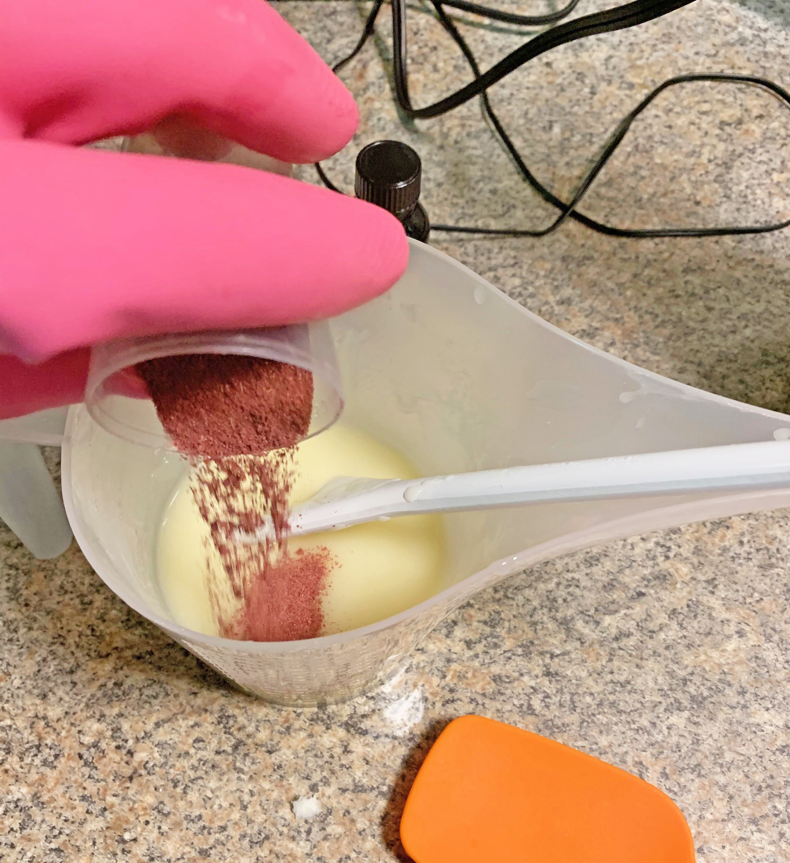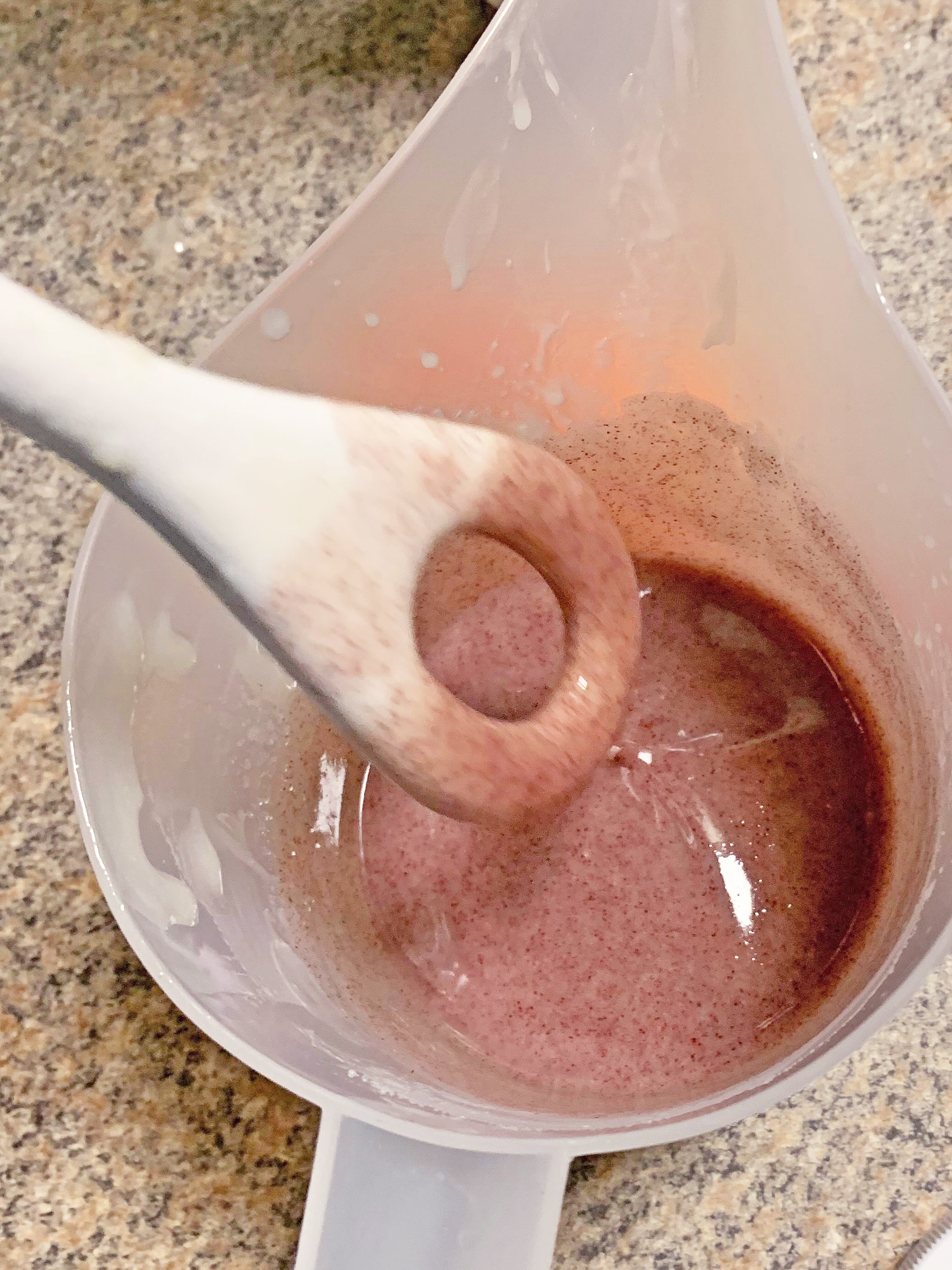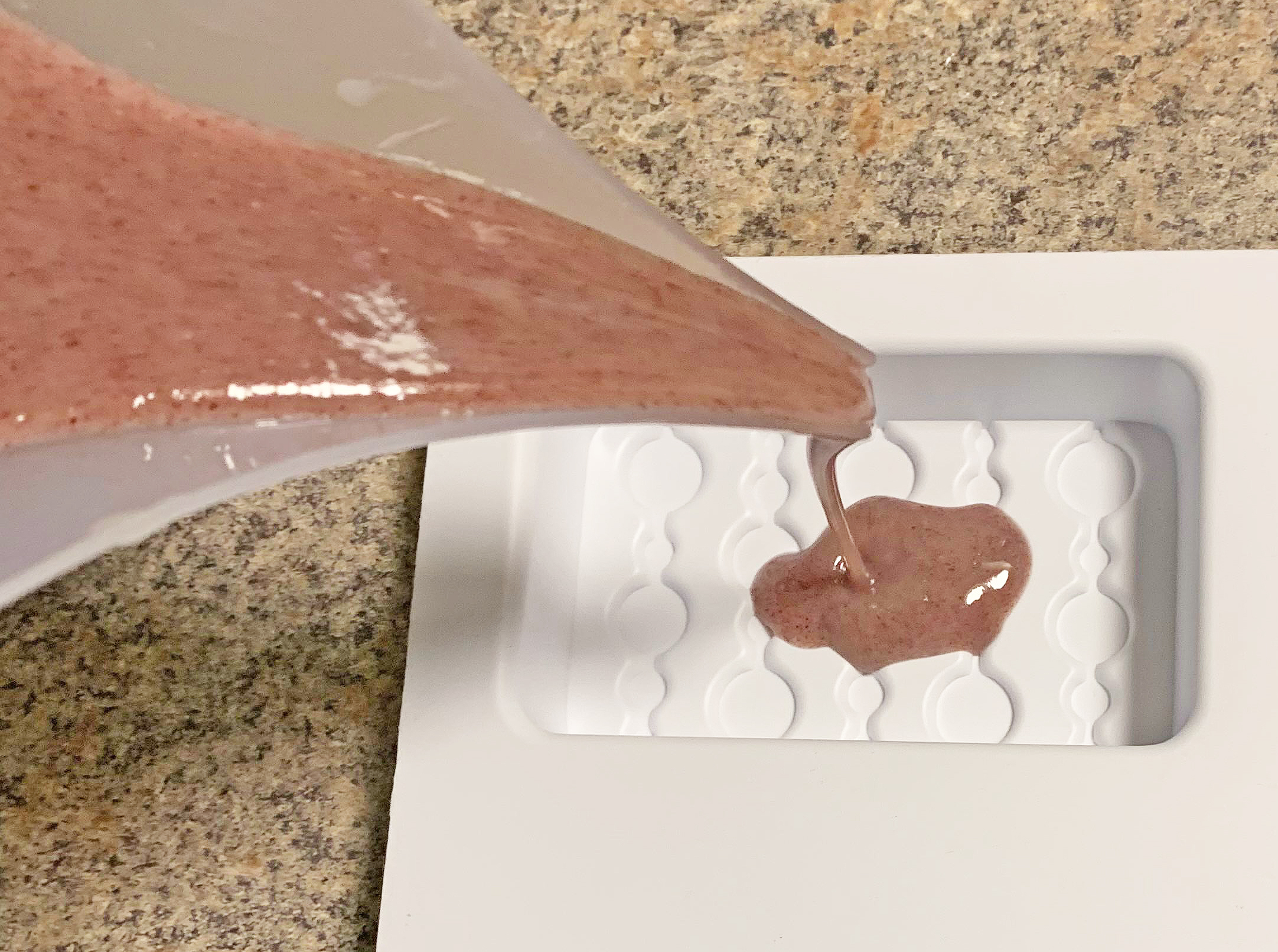Once my lye solution and oils were to my ideal temperature range, I mixed the melted oils and lye solution together until I reached a very thin trace. Then I added the milk and the fragrance oil and stirred with our soap spoon to fully incorporate the fragrance. I wanted to get a thicker trace, so I used the stick blender in short bursts until I had achieved the trace I was looking for. Then I stirred in one tablespoon of Cranberry Fiber. I was surprised at how easy it was to stir it in – no clumping! The fiber immediately dispersed throughout my soap batter, and I had the soap poured into my favorite cavity mold in no time.