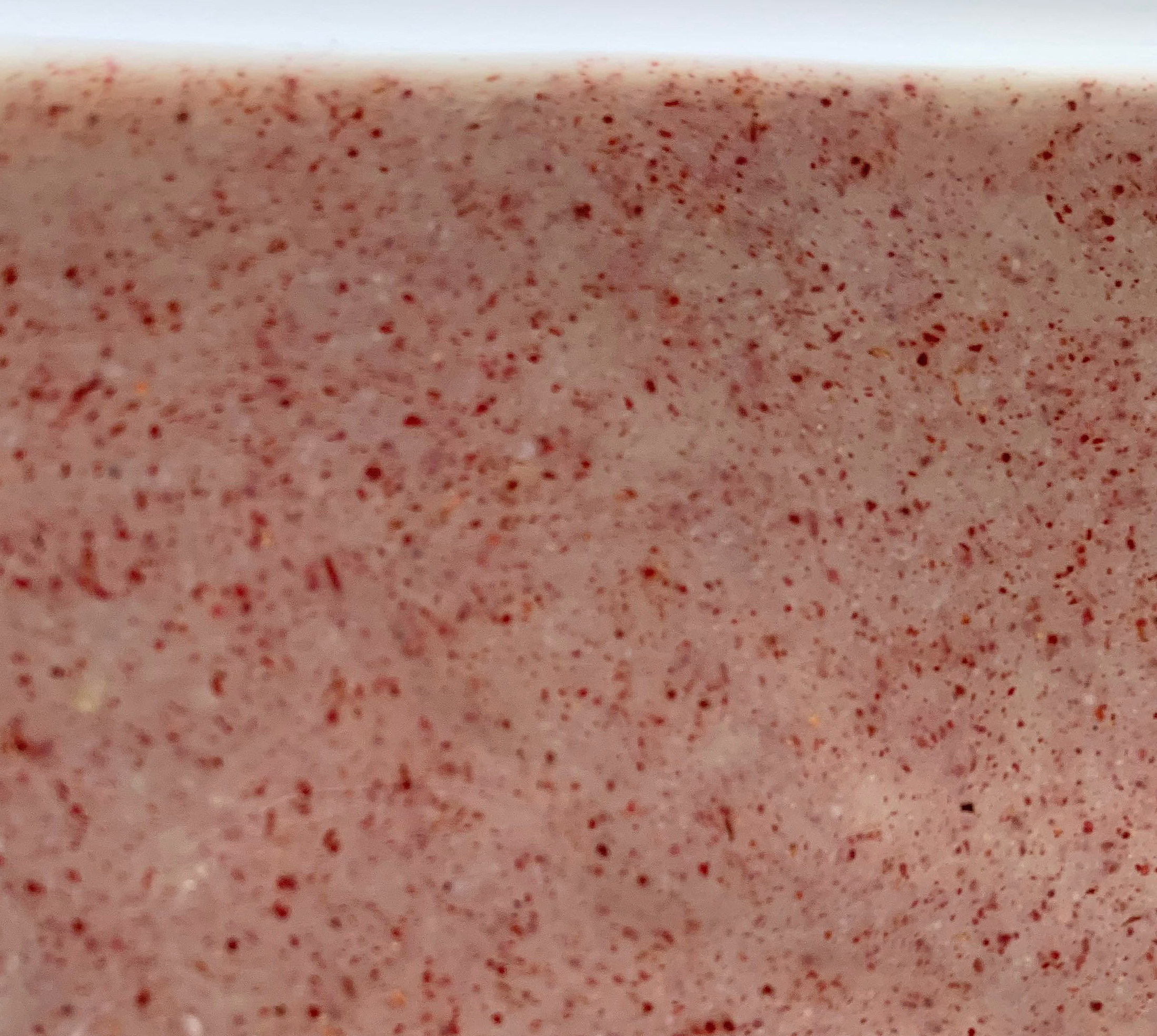 I love the look of this soap! The cranberry flecks in the light tan soap remind me a bit of pink granite. It’s a dynamite look with great visual appeal. Though bright colors and delicate swirls always grab my eye, I enjoy creating lovely soap with natural additives that don’t require a lot of extra work like using colorants and creating extravagant swirls. Best of all, this additive provides a gentle exfoliating action every time you use the soap; it’s more than just a pretty look!