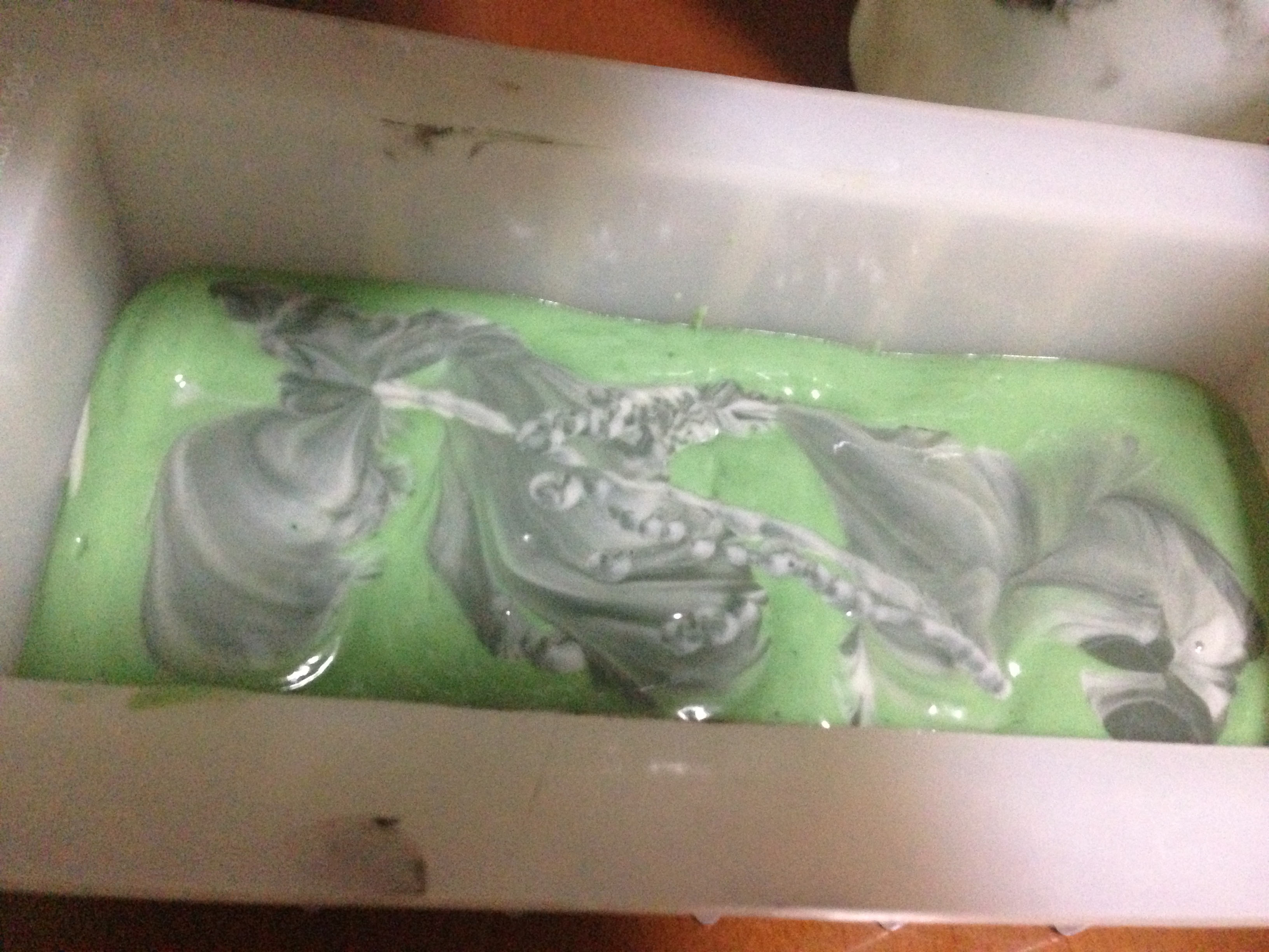Beginning to add the swirled soap to the mold.