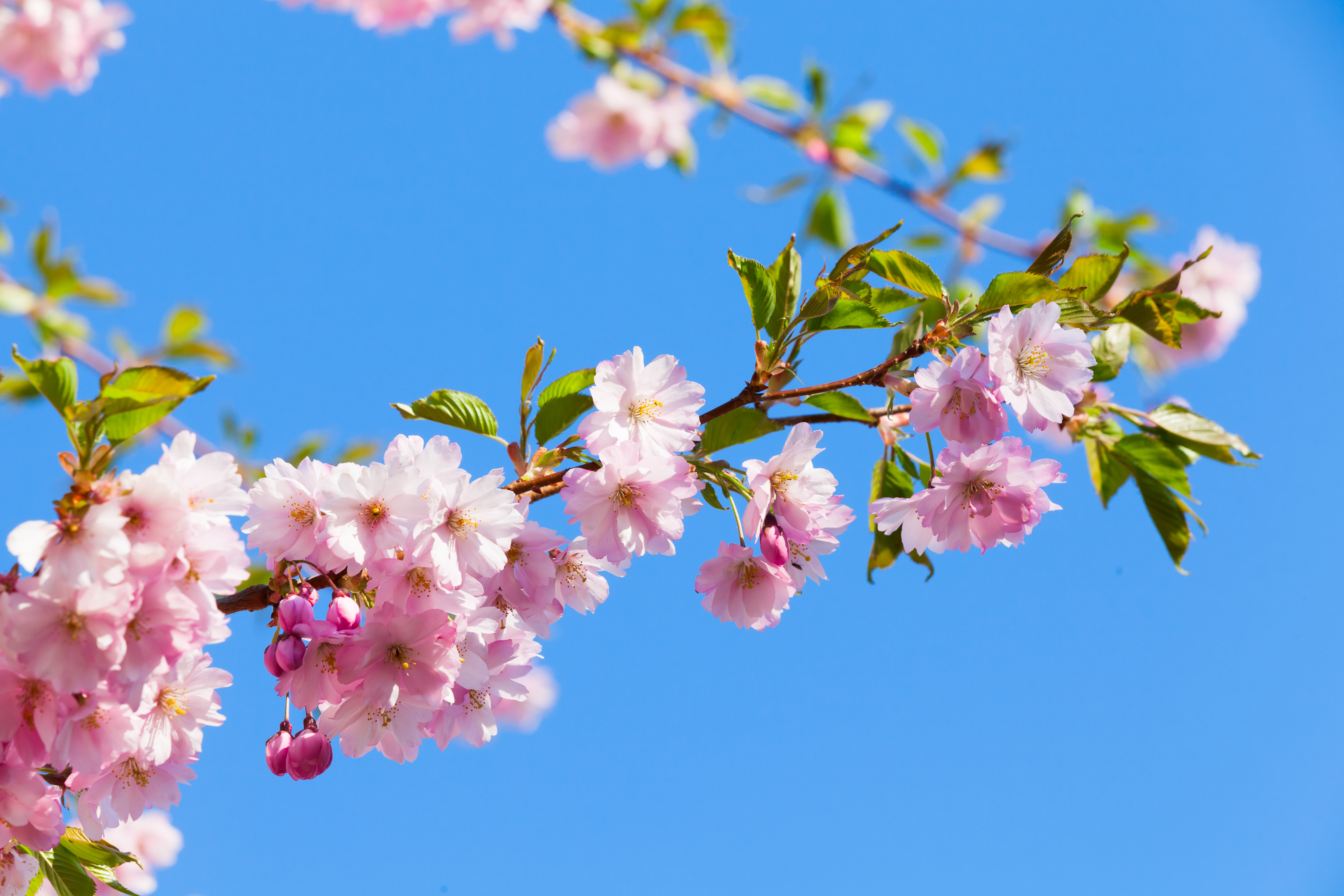 Pink flowers and fresh green leaves of cherry tree on bright blue sky background, closeup photo with selective focus